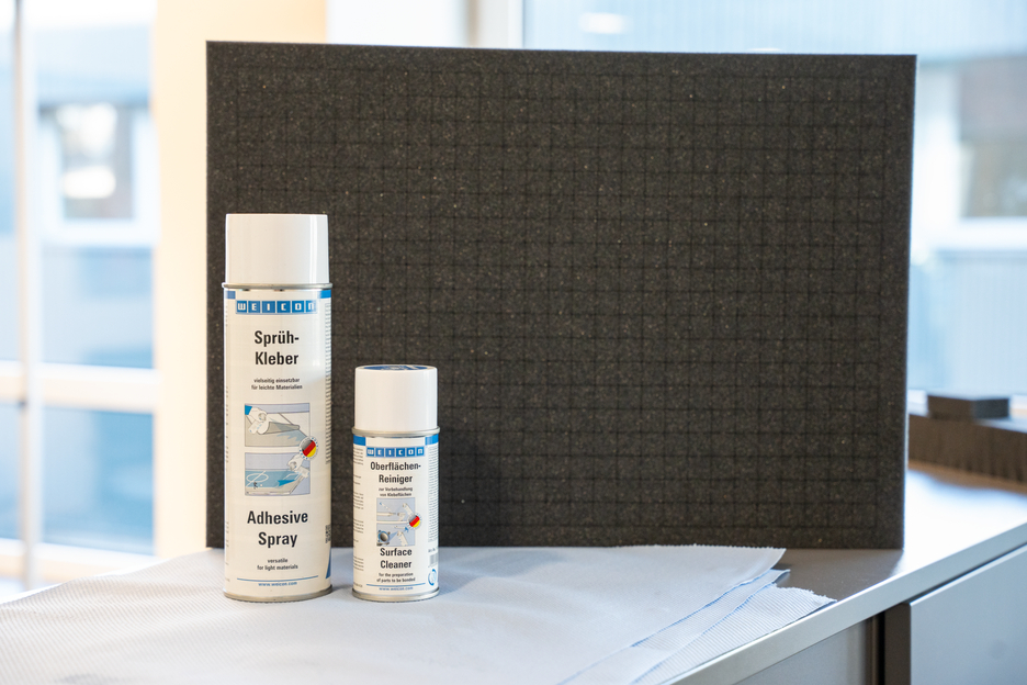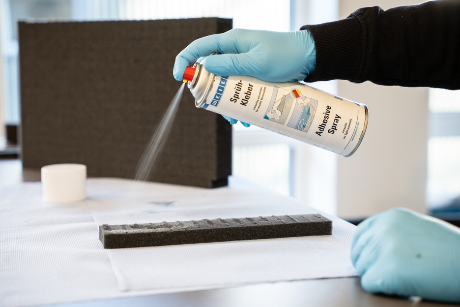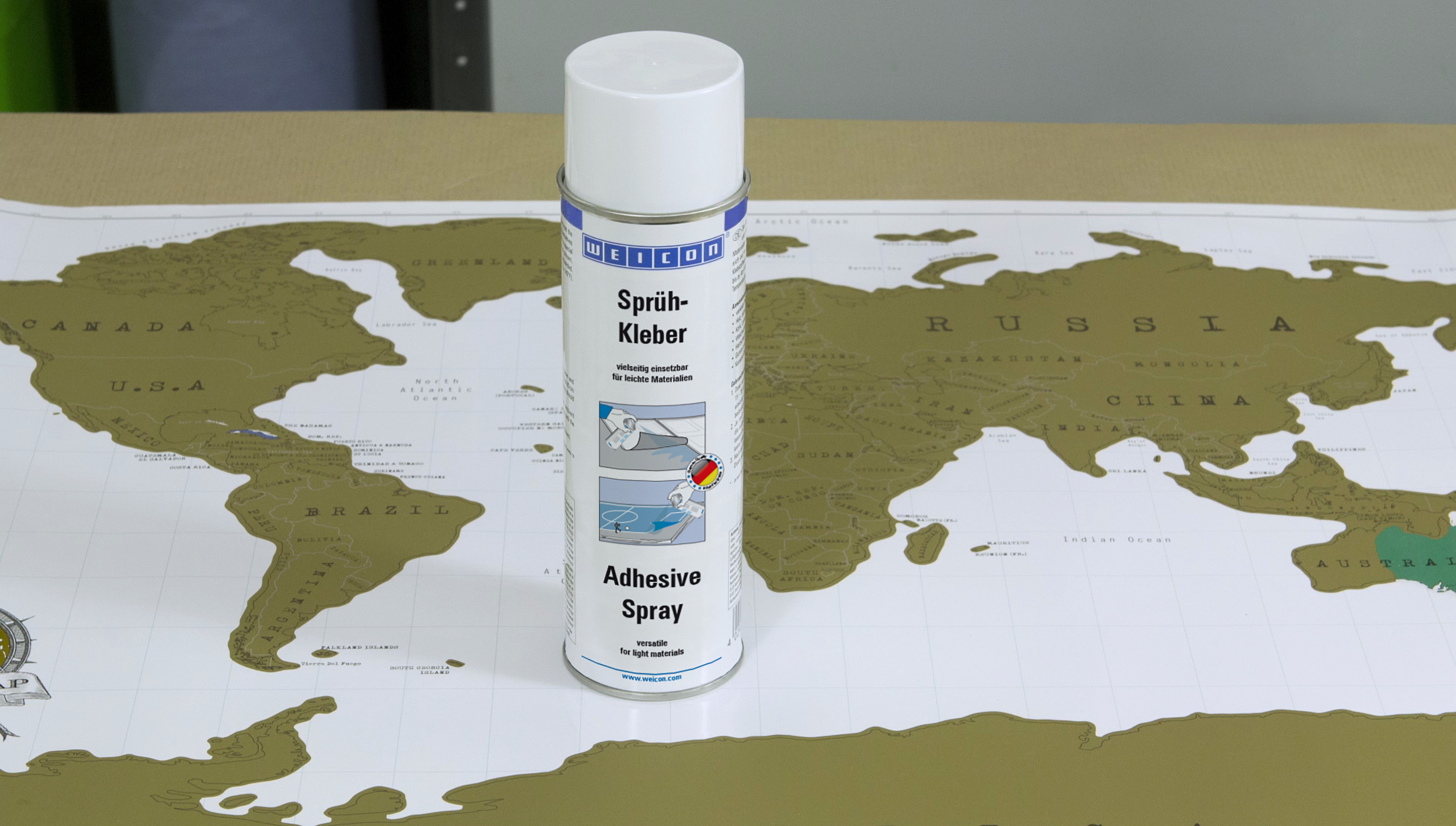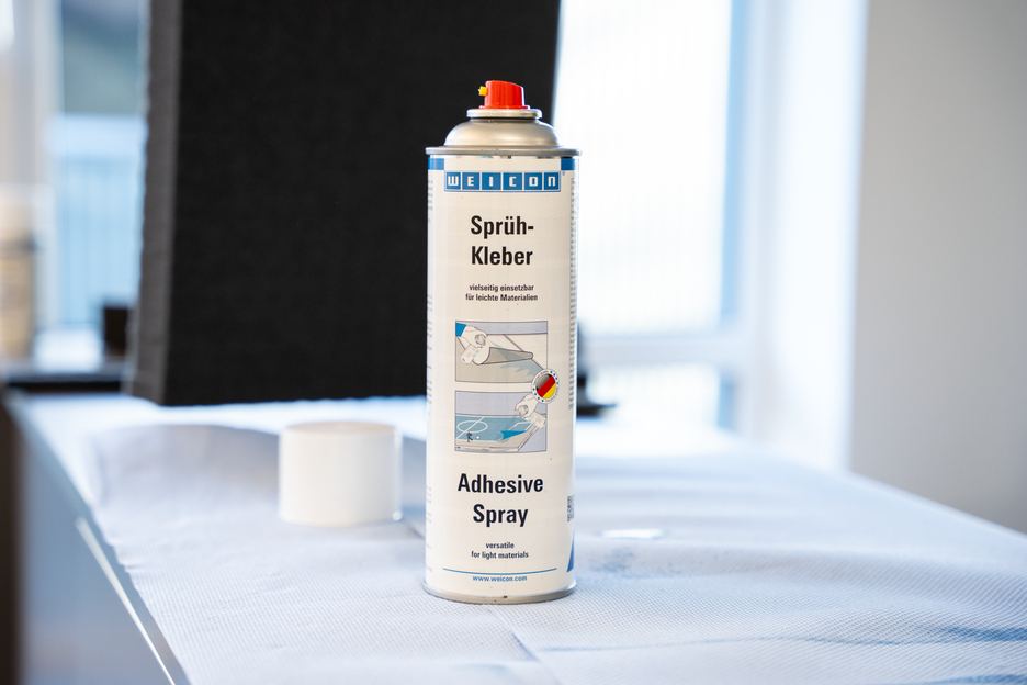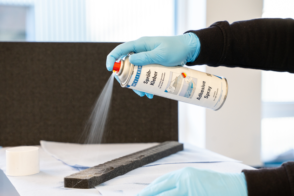 WEICON Adhesive Spray is suitable for all-purpose use and bonds light materials. WEICON Adhesive Spray is suitable for the bonding of numerous materials such as paper, cardboard, pasteboard, wood, thin veneers, cork, leather, textiles, felt, soft foam, rubber, foam rubber, and plastic film (except for PVC and polyethylene). It is especially suited for the bonding of hard foam.