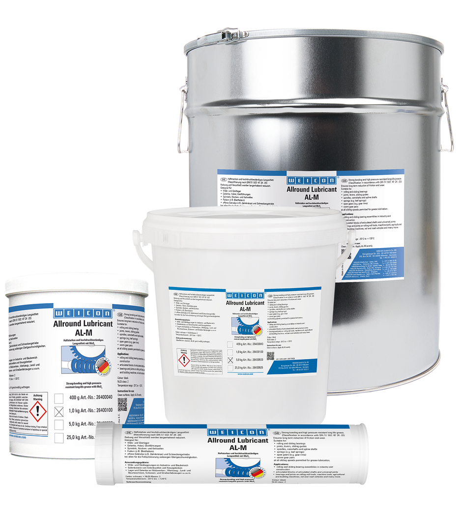 WEICON AL-M permanently reduces friction and wear and is suitable for roller and slide bearings, joints, levers, sliding guides, spindles, camshafts, spline shafts, springs, open gears and worm gears – at all sliding speeds permitted for grease lubrication.