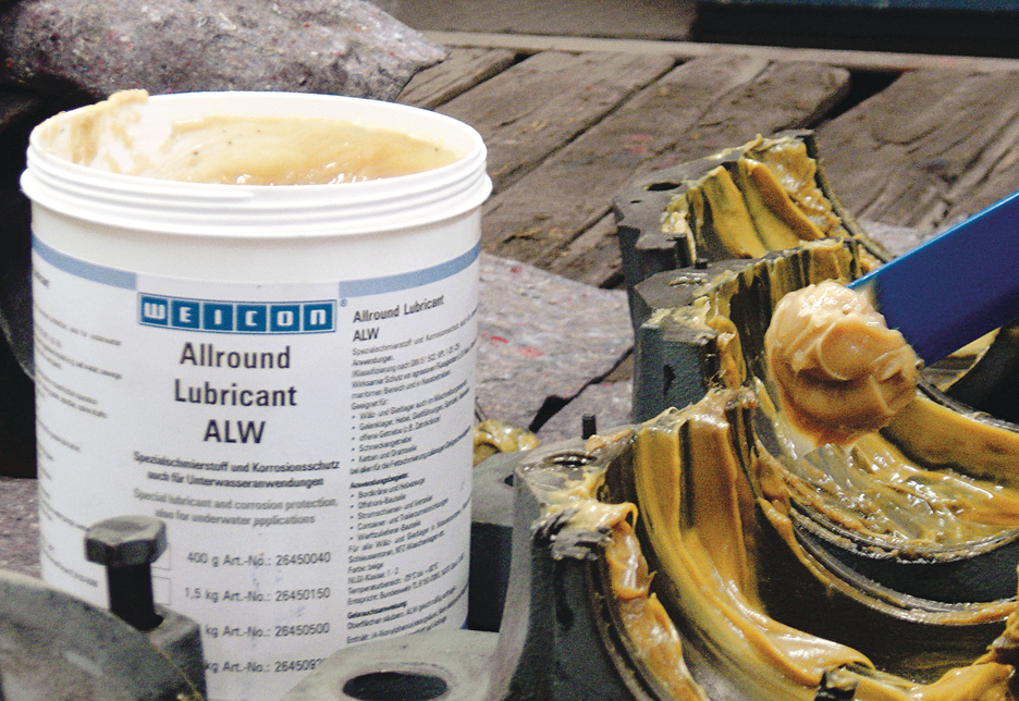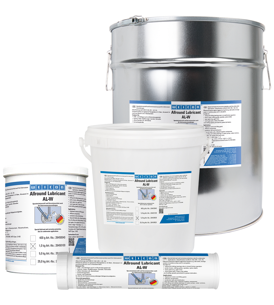 WEICON AL-W offers effective protection against aggressive liquids such as sea or waste water, both in the maritime sector and wet operations. The lubricant is suitable for roller and slide bearings even in mixed friction operation, for joints, levers, sliding guides, spindles, spline shafts, open gears, worm gears, chains and wire cables – at all sliding speeds permitted for grease lubrication.
