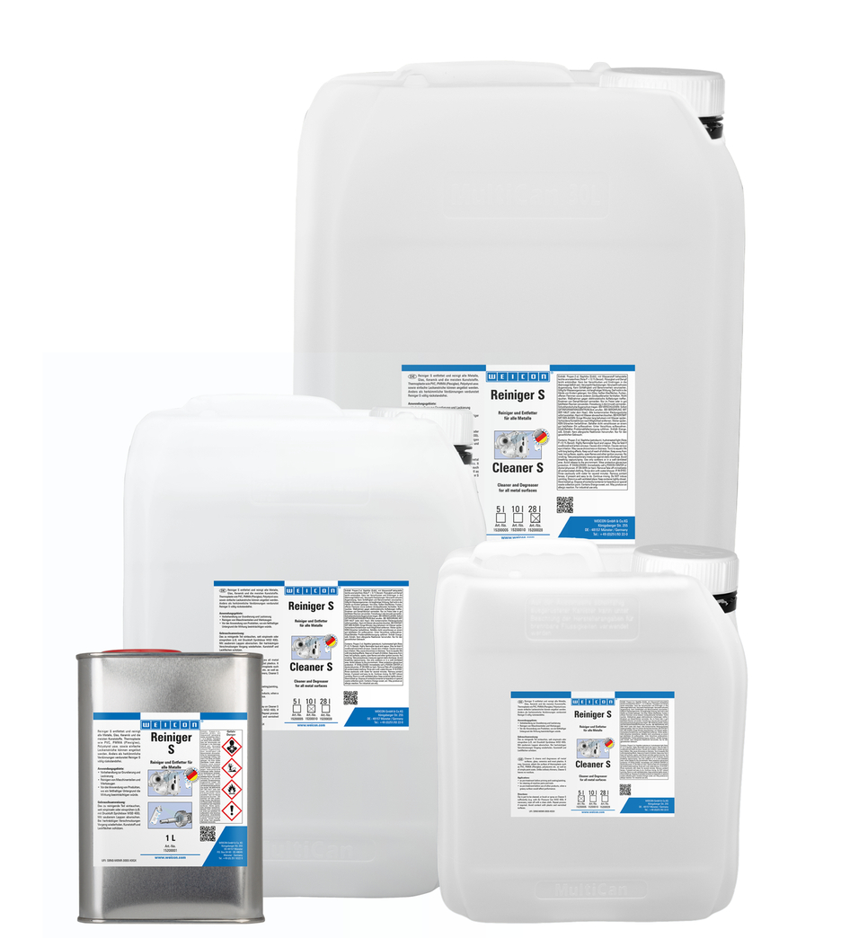 WEICON Cleaner S removes oily and greasy soiling from all metals as well as from ceramics, glass and most plastics. It can, however, attack the surface of thermoplastics such as PVC, Plexiglas, polystyrene and single layers of paint. WEICON Cleaner S evaporates quickly and, in contrast to conventional thinners, without leaving residues. It can be used for cleaning and degreasing before priming and painting, for cleaning machine parts, or before other WEICON products are applied to surfaces where a greasy underground would impair their effect.