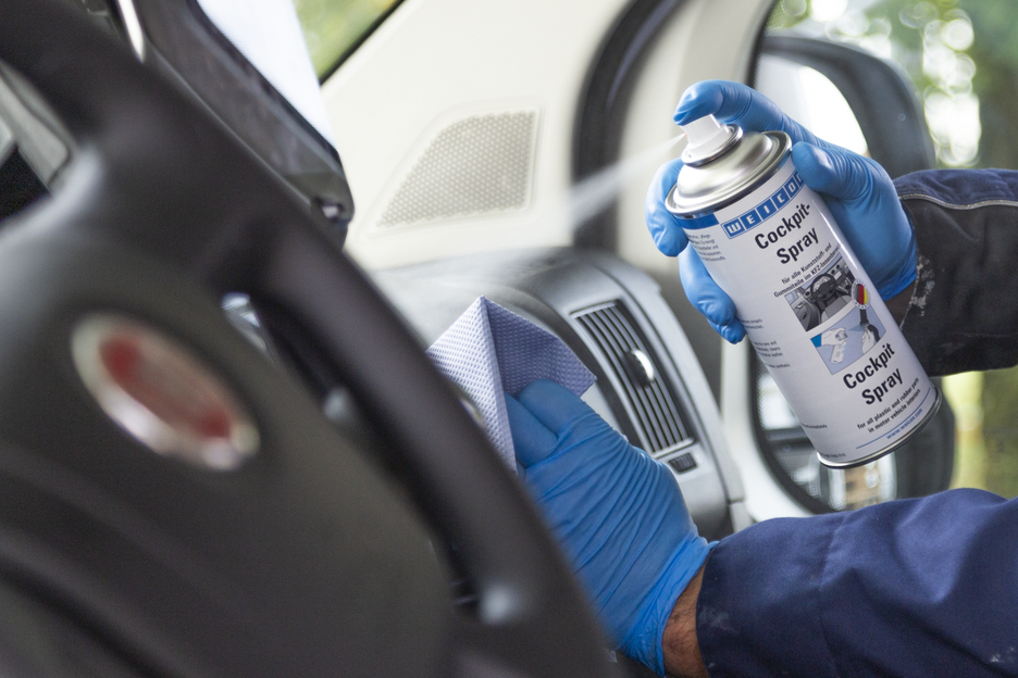 WEICON Cockpit Spray is a water-repellent care product for all plastic and rubber parts as well as for varnished wood surfaces in motor vehicle interiors. The permanent, invisible protective film prevents contaminations and creates an easy-care, dust repelling silky shine. Cockpit-Spray refreshes dull and weathered plastic. Rubber does not crack and remains supple and elastic. WEICON Cockpit-Spray eliminates squeaky and creaky noises and maintains dashboards, inside cladding, all plastic and rubber parts, leather, wood, and chromium, and car roofs covered with synthetic leather. It prevents door, window and boot seals from freezing and is used as a lubricant for seatbelts, seat guides, sunroofs, window guides, door locks and wherever greases would cause soilings.