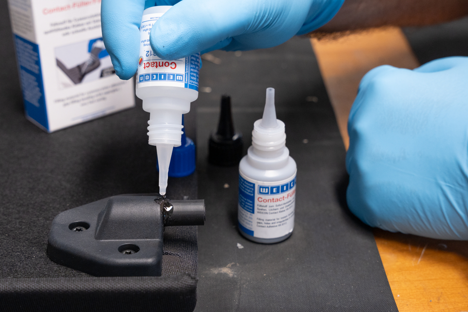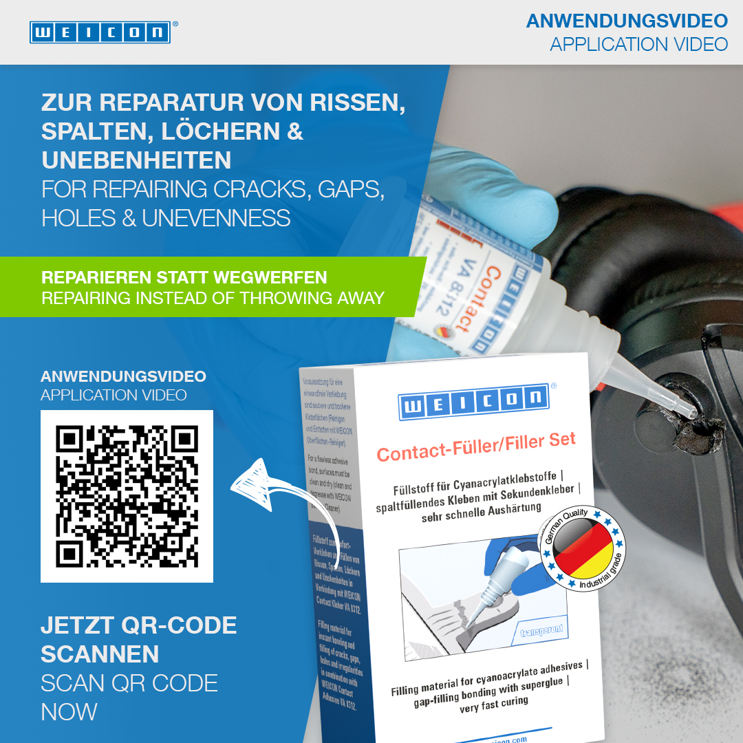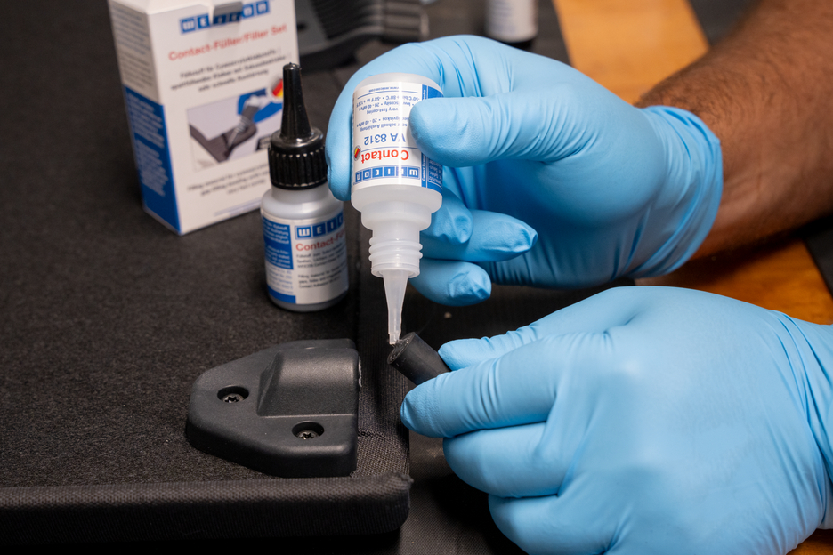 WEICON Contact VA 8312 is suitable for the bonding of various rubber materials, such as solid rubber or cellular rubber, plastics and EDPM elastomers. In combination with WEICON CA-Primer, VA 8312 can also be used for polyolefines (PE-polyethylene, PP-polypropylene). In combination with WEICON Contact Filler, VA 8312 is suited for the instant bonding and filling of cracks, clefts, holes and uneven surfaces.