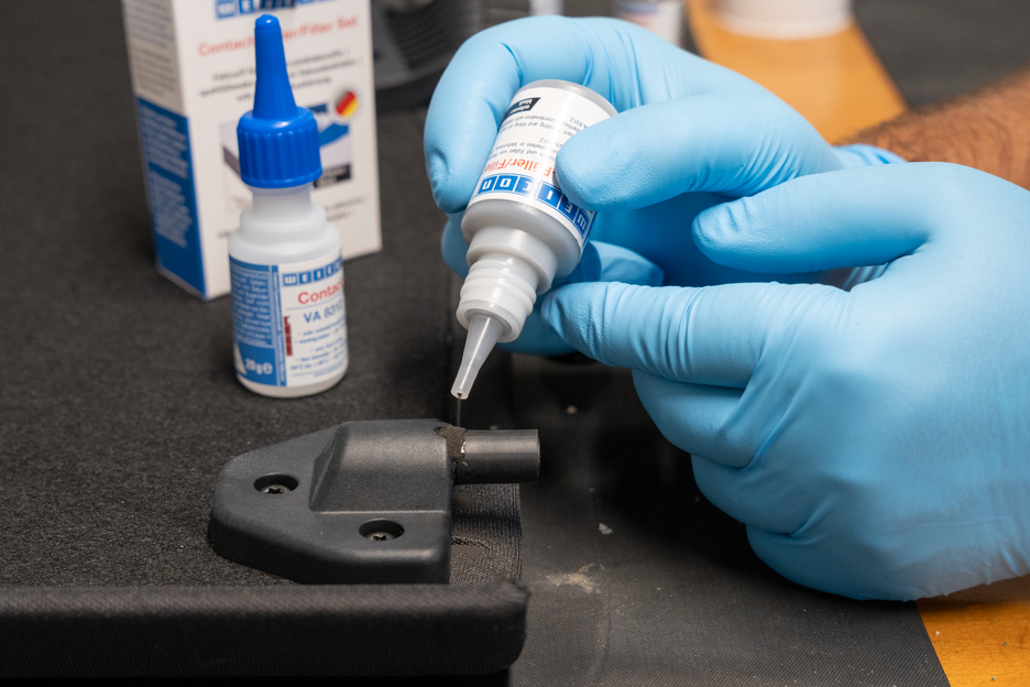 WEICON Contact VA 8312 is suitable for the bonding of various rubber materials, such as solid rubber or cellular rubber, plastics and EDPM elastomers. In combination with WEICON CA-Primer, VA 8312 can also be used for polyolefines (PE-polyethylene, PP-polypropylene). In combination with WEICON Contact Filler, VA 8312 is suited for the instant bonding and filling of cracks, clefts, holes and uneven surfaces.