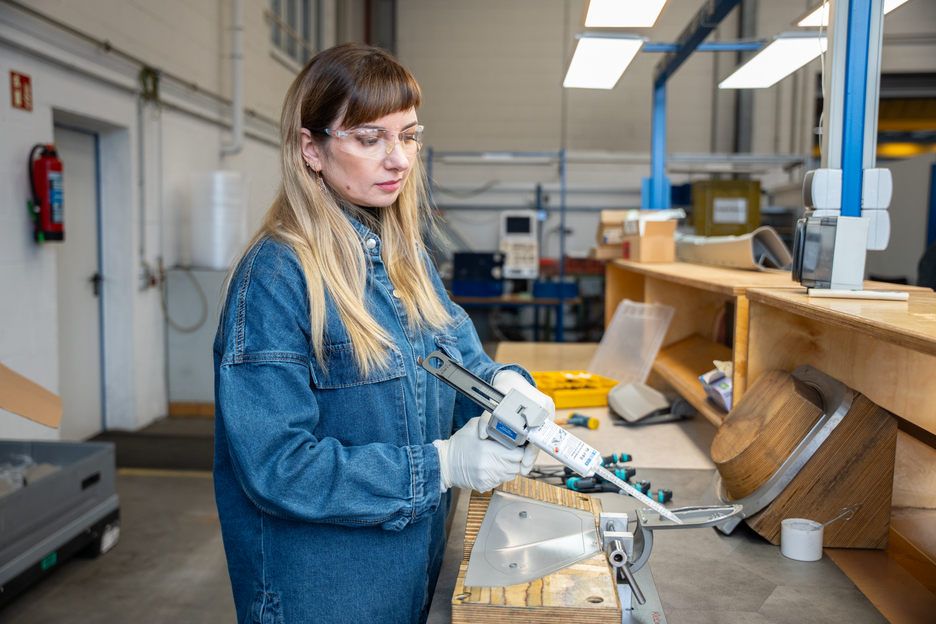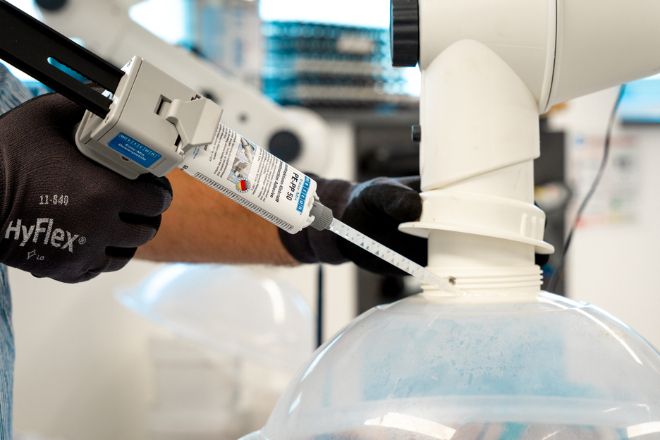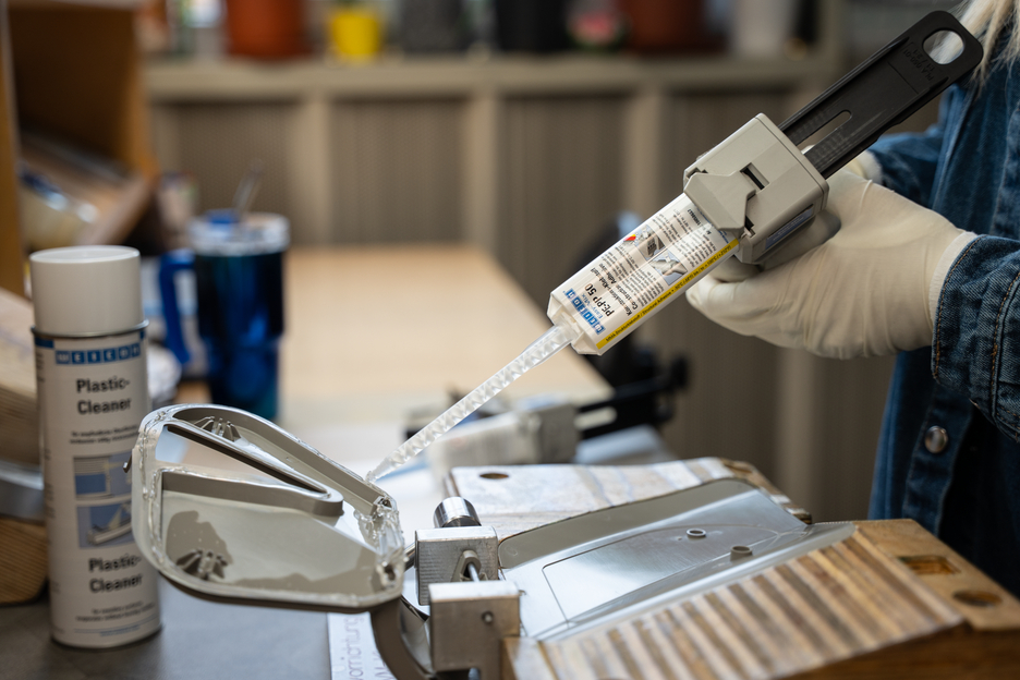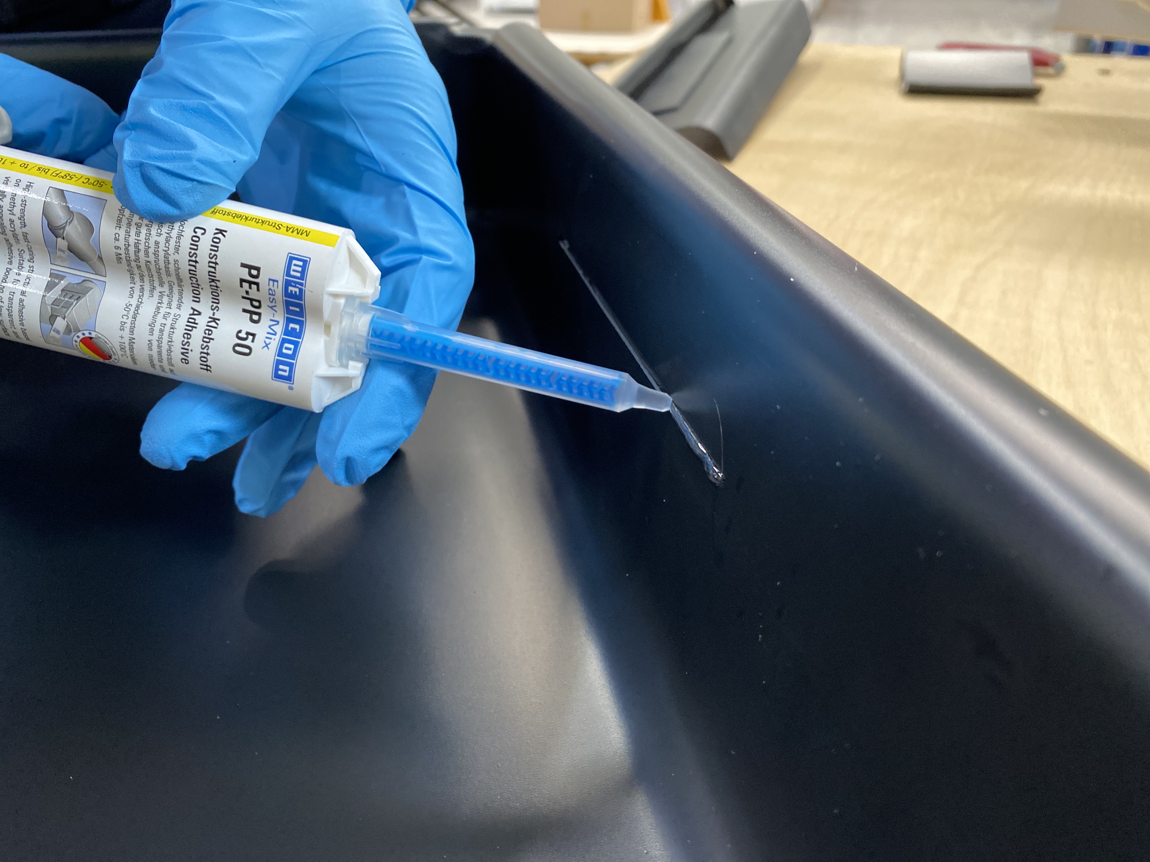 WEICON Easy-Mix PE-PP 50 is a 2-component construction adhesive based on methyl acrylate. Due to its transparent curing, it is particularly suitable for visually appealing, high-strength adhesive bonding of low surface energy plastics, such as PE, PP and TPE. Thanks to its special formula, the adhesive is suitable for zero-gap bonds and for connecting surfaces with extremely small bonding gaps of less than 0,2 mm. The structural adhesive has a fast strength build-up and a high final strength. It is impact-resistant, ageing-resistant, chemical-resistant, and slightly thixotropic. PE-PP 50 has a short pot life of six minutes and a processing time of twelve minutes. It is applied with a 1:1 system and does not require pre-treatment of the bonding surfaces, as the adhesive has an integrated primer. For the application of the Easy-Mix product, the Dispenser Easy-Mix D 50 is required.