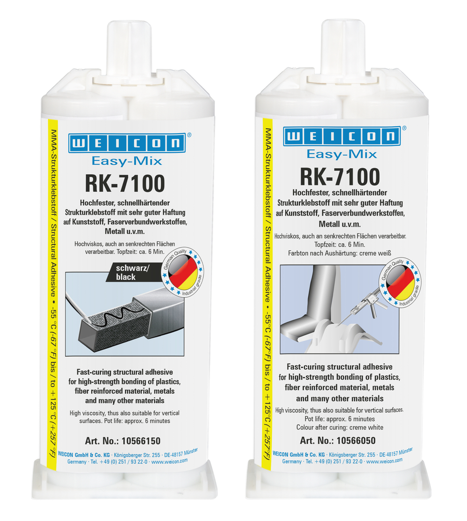 The structural acrylic adhesive WEICON Easy-Mix RK-7100 can be used to bond numerous materials, such as plastics, metals and ceramics with high tensile, shear and peel strength. It is particularly suitable for structural bondings where high strength connections are required. It is highly viscous and is therefore suitable for processing on vertical surfaces. RK-7100 is universally applicable and can be used, for example, in plastics technology, in metal construction, in car body and vehicle construction, in mechanical engineering, in electrical engineering, model and mould making, and in trade show and exhibition construction.