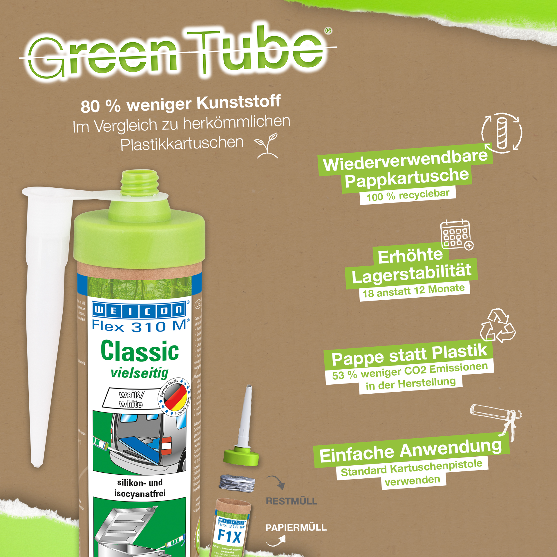 WEICON Flex 310 M Classic is strong, paintable (wet-on-wet), sandable, has an outstanding resistance to ageing and good resistance to UV rays. It is resistant to fresh and salt water and is free of silicone, isocyanate, halogens and solvents. The product as an ISEGA certificate and can be used as an adhesive in the food technology. Flex 310 M Classic is an elastic adhesive based on MS polymer and is suitable for the bonding of metals, many plastics, ceramics, wood, glass and stone. This adhesive and sealant can be used in metal construction, tank and apparatus engineering, carriage, vehicle and container construction, ventilation and air conditioning systems, in the electrical industry, yacht and boat construction, and in all applications where silicones or products containing silicones are not suitable.