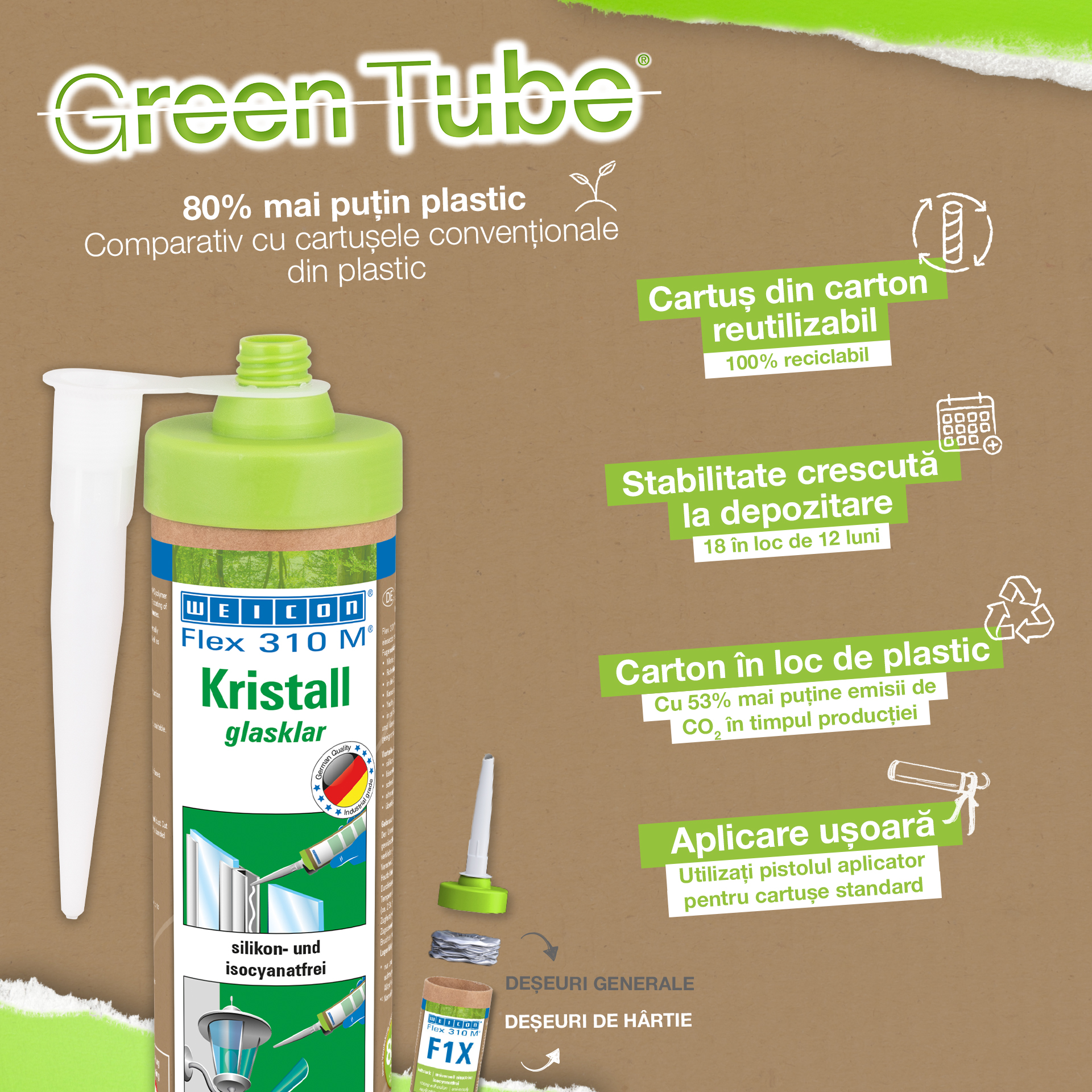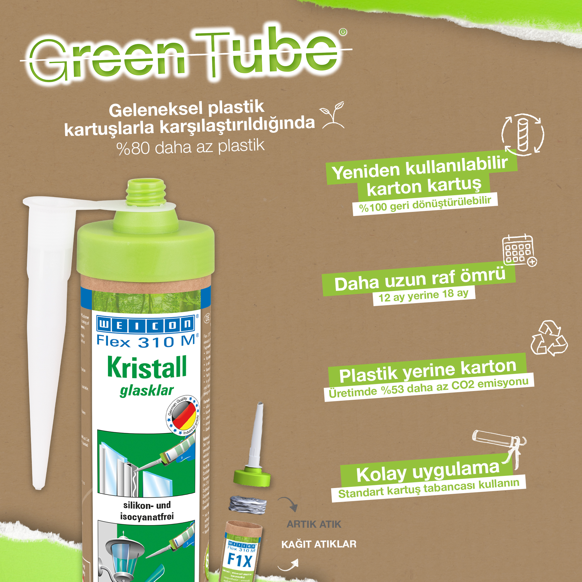 WEICON Flex 310 M Crystal is transparent, strong, paintable (wet-on-wet), sandable, has an outstanding resistance to ageing and good resistance to UV rays. It contains no silicone, isocyanate, halogens or solvents. It has an ISEGA certificate and can be used as an adhesive in the food technology. Flex 310 M Crystal is an elastic adhesive suitable for bonding glass, PC* and acrylic glass*, metals, many plastics, ceramics, wood and stone. The product is crystal clear after curing and is particularly suited for elastic joints where the adhesive should or must not be visible. It can be used in plastic processing, metal construction, tank and apparatus engineering, in ventilation and air conditioning systems, the electrical and lighting industry, in exhibition stand construction and shopfitting, and in all applications where silicones or products containing silicones are not suitable. (* = only for tension-free bonding)