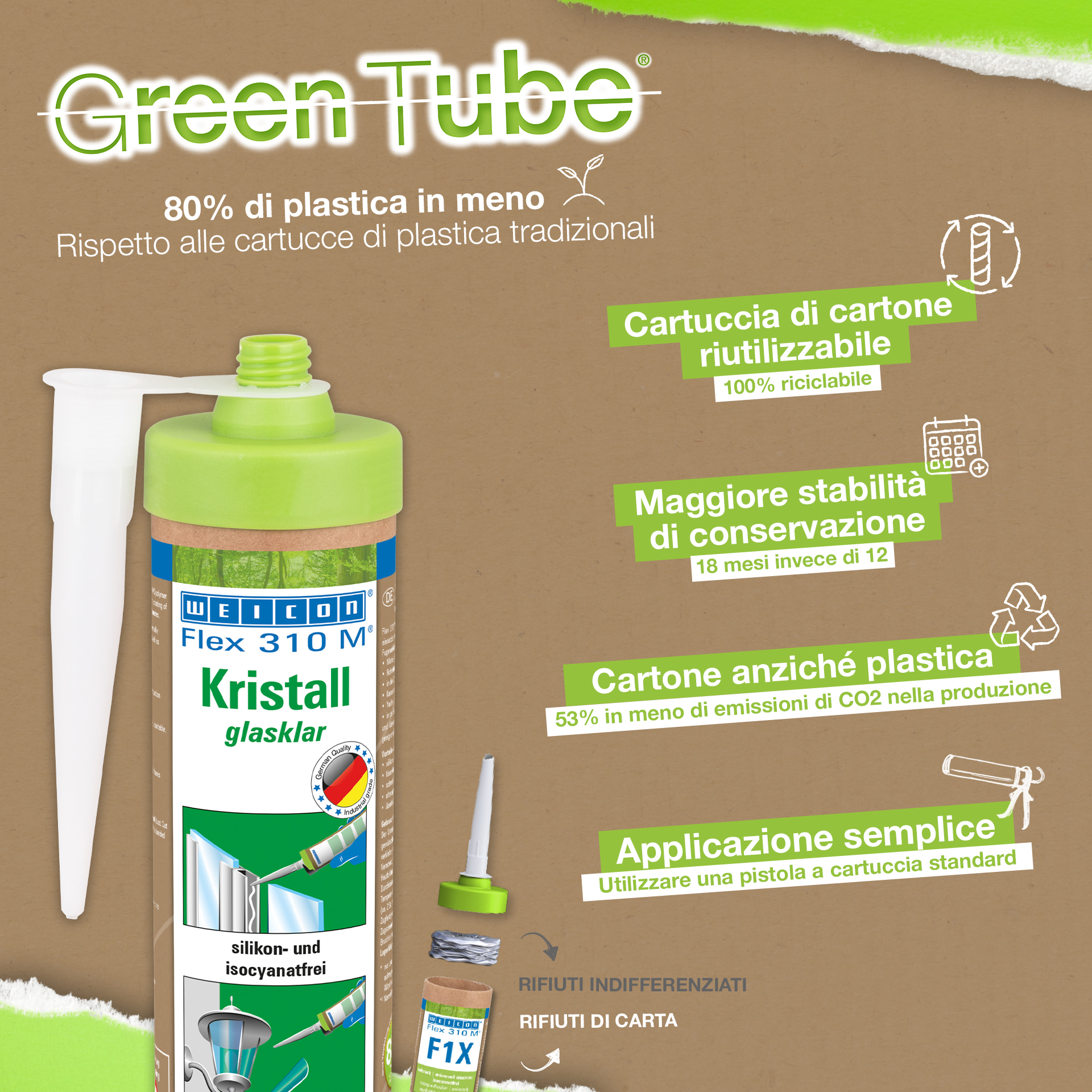 WEICON Flex 310 M Crystal is transparent, strong, paintable (wet-on-wet), sandable, has an outstanding resistance to ageing and good resistance to UV rays. It contains no silicone, isocyanate, halogens or solvents. It has an ISEGA certificate and can be used as an adhesive in the food technology. Flex 310 M Crystal is an elastic adhesive suitable for bonding glass, PC* and acrylic glass*, metals, many plastics, ceramics, wood and stone. The product is crystal clear after curing and is particularly suited for elastic joints where the adhesive should or must not be visible. It can be used in plastic processing, metal construction, tank and apparatus engineering, in ventilation and air conditioning systems, the electrical and lighting industry, in exhibition stand construction and shopfitting, and in all applications where silicones or products containing silicones are not suitable. (* = only for tension-free bonding)