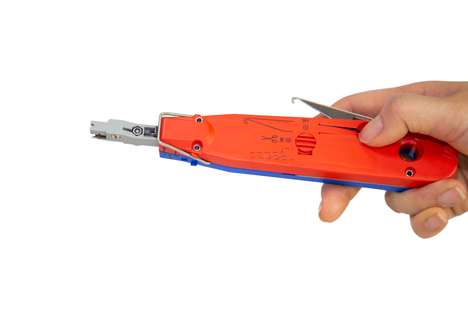 For the solderless, screwless and no-stripping inserting and simultaneously cutting of wire ends into LSA punch-down blocks I with retractable hook and unlocking blade for conductor diameters 0.35 - 0.9 mm and wire diameters 0.7 - 2.6 mm features a sensor for scanning the wire end position
