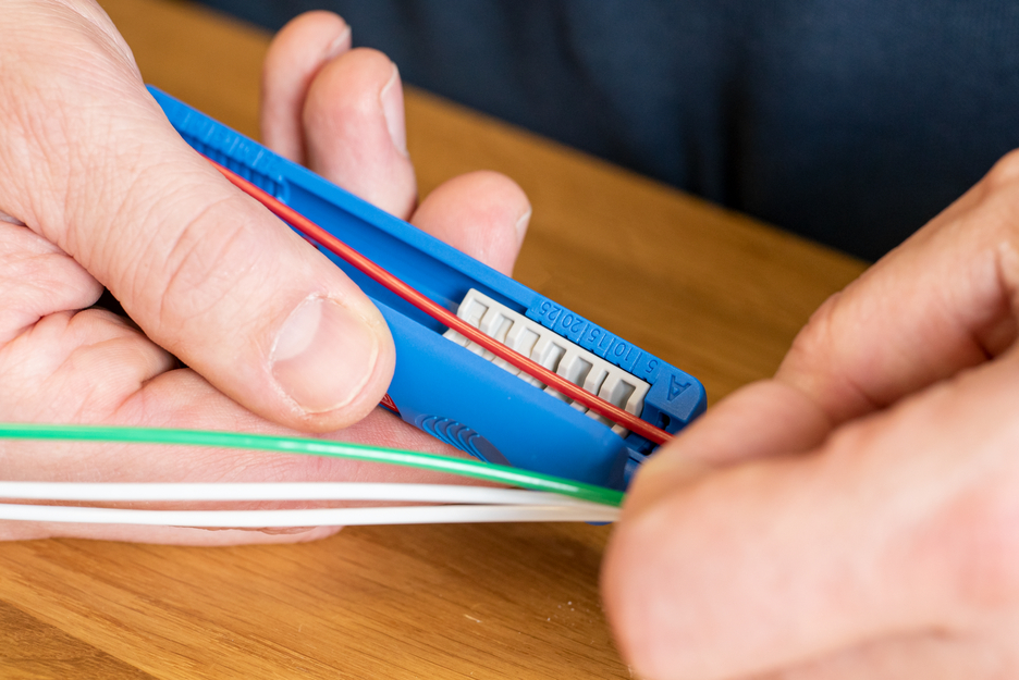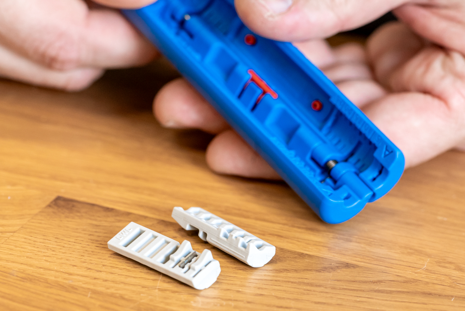The stripping tool Fibre Optic Tube No. 2 has been specially designed for quick access to the optical fibres in loose tubes in buffer tubes from 1.2 mm to 4 mm diameter. It is suitable for a wall thickness of 0.15 mm to 0.6 mm. With the knife in the module and a special insertion point, the buffer tube can be conveniently put through the handy tool. This gives the user fast and process-safe access to the optical fibre in no time at all. The knife in the stripping tool easily cuts the buffer tube (e.g. made of PE) and the user can simply bend the tube without damaging the sensitive glass fibre. If necessary, the insertion point and the knife in the half-shells can be replaced or renewed as modules.