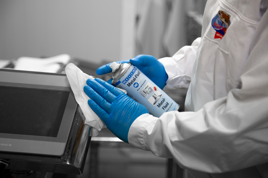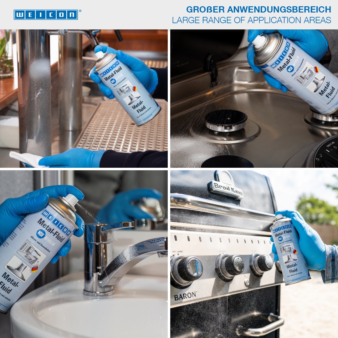 WEICON Metal-Fluid is a care and cleaning product for indoor matt and polished surfaces and has an NSF registration. Metal-Fluid protects, cleans and cares for metal surfaces as well as ceramics, wood, glass and plastics. It does not dissolve etched and printed markings or plastic surfaces and rubber seals.