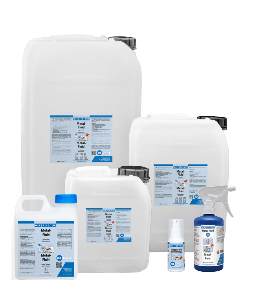 WEICON Metal-Fluid is a care and cleaning product for indoor matt and polished surfaces and has an NSF approval. Metal-Fluid protects, cleans and cares for metal surfaces as well as ceramics, wood, glass and plastics. It does not dissolve etched and printed markings or plastic surfaces and rubber seals.