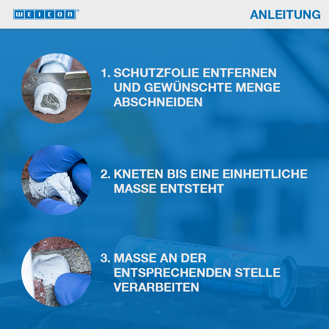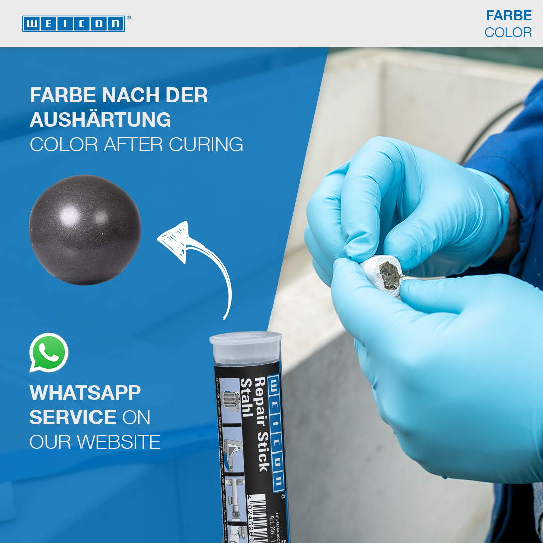 It is particularly suitable for the fast and high-strength repair and bonding of metal parts and for patching and sealing cracks, holes and leaks in machine parts, tanks and pipelines, containers, pumps and housings, balcony railings, banisters, and torn-out threads. The WEICON Repair Stick Steel can be used in machine and system construction, in tank construction and apparatus engineering, in the food, cosmetics and pharmaceutical industries and in many other applications.