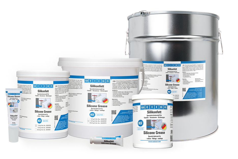 WEICON Silicone Grease is highly adhesive, transparent and very compatible with plastics. Owing to its NSF H1 registration, it is suitable as a lubricant for valves, fittings and seals in sensitive areas. The grease complies with the Guideline for Hygienic Assessment of Organic Materials in Contact with Drinking Water (KTW guideline) by the German Federal Environment Agency. It can be used in the food and beverage industry, in sanitary and heating construction, in the pharmaceutical industry as well as in sealing technology. WEICON Silicone Grease is safety-tested by the German Federal Institute for Materials Research and Testing (BAM) – cf. leaflet 034-1 “List of non-metallic materials for use in oxygen” (DGUV information 213-075) of BG RCI. The grease is especially material-friendly, odourless and tasteless and has a temperature resistance of -50 °C to +200 °C. WEICON Silicone Grease is suitable for the lubrication of plastic parts, rubber parts and seals, valves, fittings and gaskets, for devices and systems and as an assembly aid for O-rings.