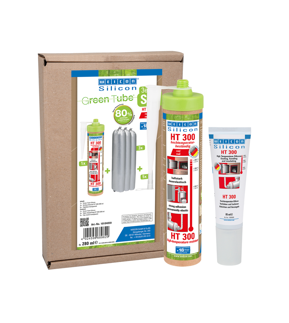 WEICON HT 300 is red, high-temperature-resistant (+300 °C/+572 °F), free of solvents, strong, and acetoxy-curing. It is resistant to weathering, ageing and chemicals and is extremely elastic (breaking elongation of approx. 300%). The product is particularly suitable for heat-exposed bonds and seals and adheres very well to steel, aluminium, glass, ceramics and many other materials. The adhesive and sealant can be used in industrial furnaces, flue gas systems, heating installations, exhaust gas routing, heating cabinets and in many additional areas.