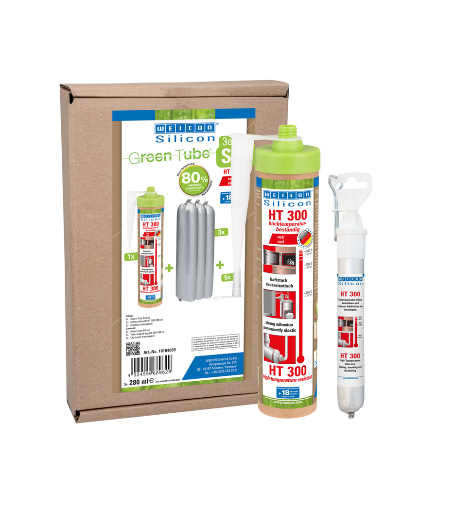 WEICON HT 300 is red, high-temperature-resistant (+300 °C/+572 °F), free of solvents, strong, and acetoxy-curing. It is resistant to weathering, ageing and chemicals and is extremely elastic (breaking elongation of approx. 300%). The product is particularly suitable for heat-exposed bonds and seals and adheres very well to steel, aluminium, glass, ceramics and many other materials. The adhesive and sealant can be used in industrial furnaces, flue gas systems, heating installations, exhaust gas routing, heating cabinets and in many additional areas.