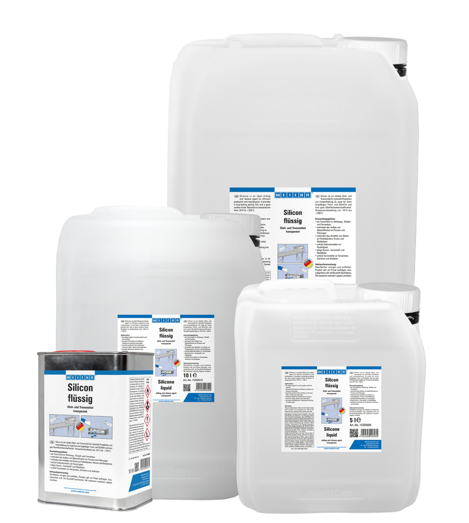WEICON Silicone is a sliding and release agent as well as a preservative and care product for plastic, rubber and metal. WEICON Silicone provides a durable separating film and good surface properties. It prevents the development of adhesive residue in presses and guides, the adhesion of goods on conveyor belts, chutes and slides. WEICON Silicone protects electrical contacts from moisture, maintains rubber, plastic and metal parts, protects rubber parts from becoming brittle, from freezing and sticking and allows sunroof rails, seat tracks and seatbelts to run smoothly.