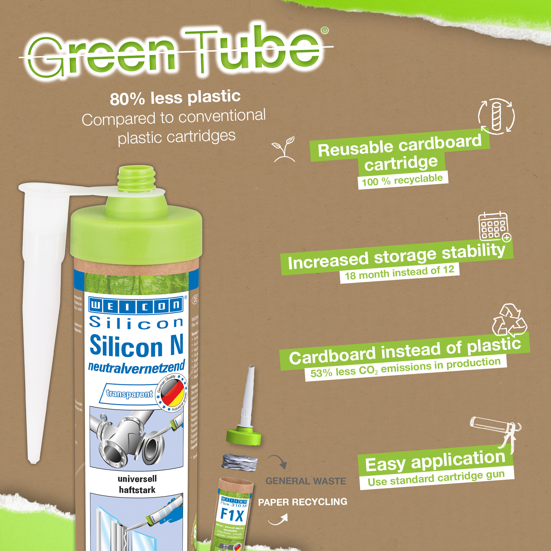 WEICON Silicone N is free of solvents, neutrally vulcanizing, strong, permanently elastic, resistant to weathering, ageing and chemicals, temperature-resistant up to +180 °C (+356 °F), extremely elastic (breaking elongation of approx. 550%) and can be used universally. Silicone N adheres very well to all metals, glass, ceramics, and many other materials. Silicone N can be used in plastic processing, the electrical industry, energy technology, the lighting industry, exhibition construction and shopfitting, and in many other industrial areas.