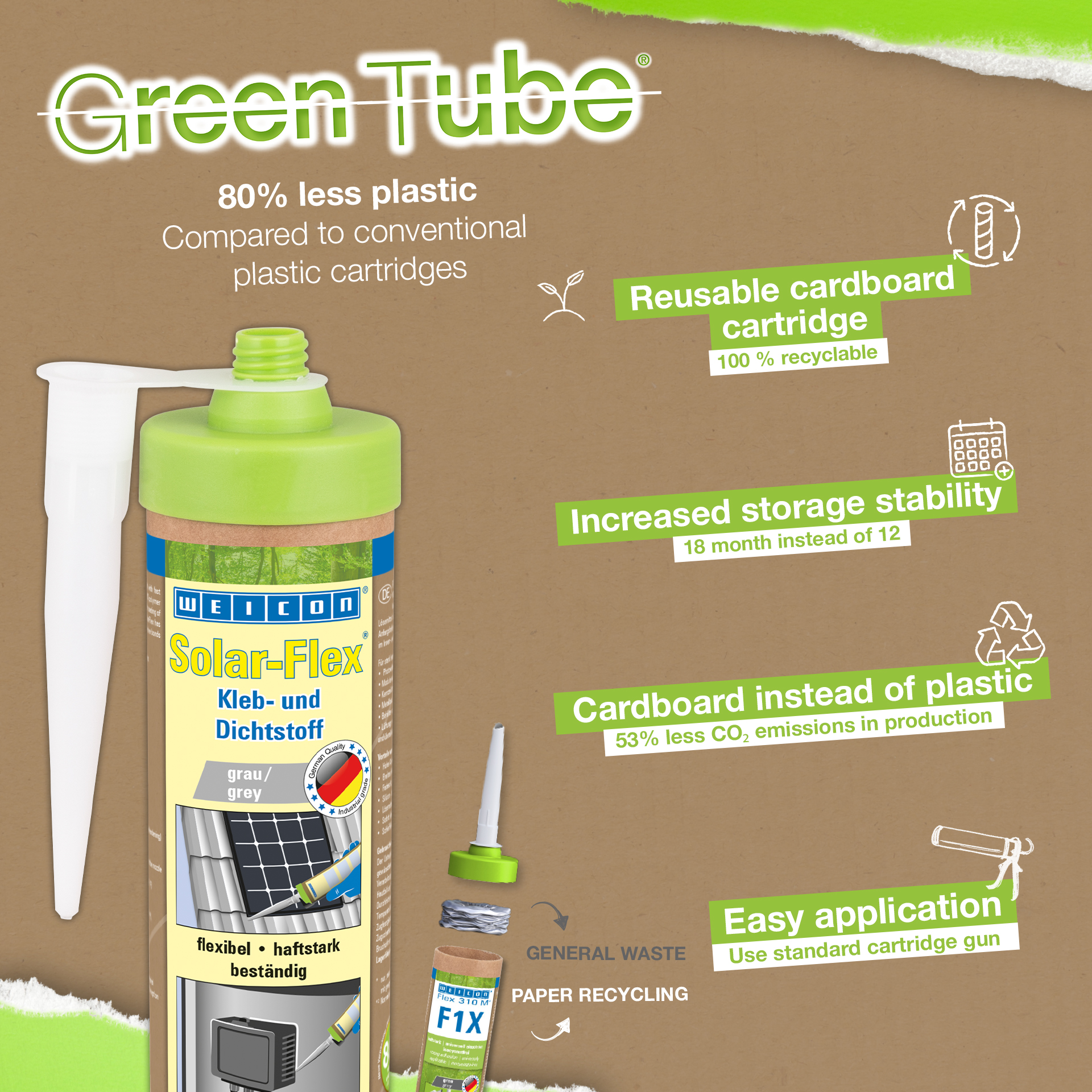 WEICON Solar-Flex is strong, non-corrosive, paintable (wet-on-wet), weather-resistant and resistant to UV rays. It is free of silicone, isocyanate, halogens and solvents. Solar-Flex is an elastic adhesive based on MS polymer specially developed for the solar industry. Both the very high initial bonding power and the fast development of adhesive strength enable bondings even on vertical surfaces. Replaces traditional fixings in the assembly of solar and photovoltaic power systems.