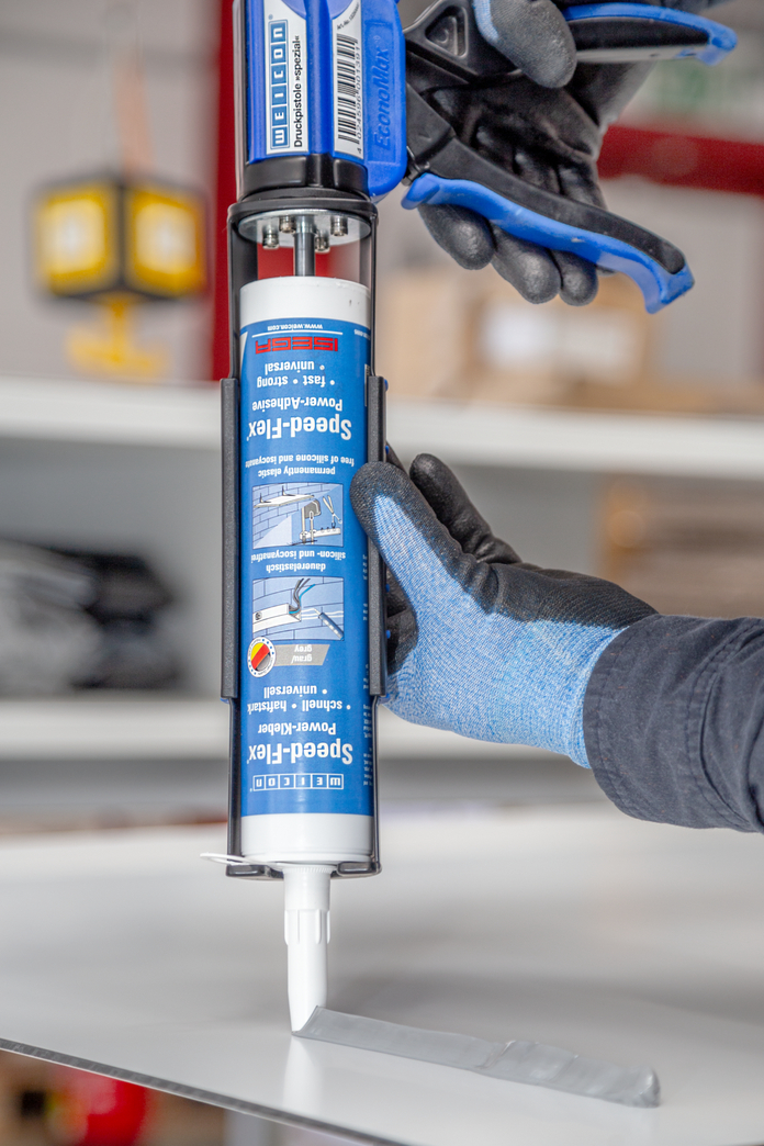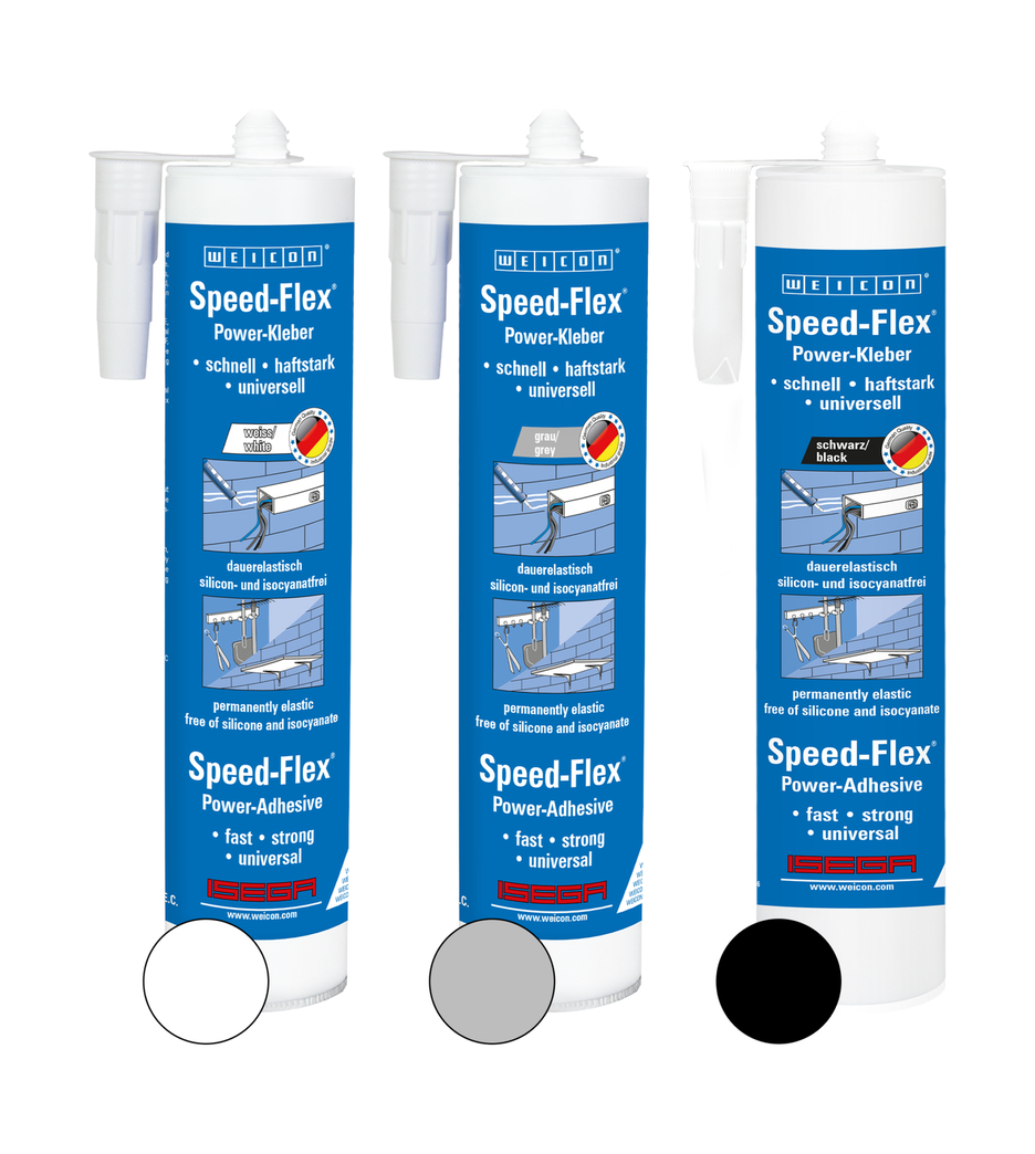 WEICON Speed-Flex is very strong, pasty, stable, paintable (wet in wet), resistant to ageing, weathering, and UV rays and free of silicone, isocyanate, halogen and solvents. WEICON Speed-Flex has an ISEGA certificate and can be used as an adhesive in the food technology. It is an adhesive and sealant based on MS polymer with extremely high initial strength and is suitable for the bonding of metals, many plastics, ceramics, wood, glass and stone. Speed-Flex replaces traditional fixings such as screws, pegs, rivets, etc. The very high initial strength makes bonding possible even on vertical surfaces in indoor and outdoor areas. The product can be used for drywall and interior work, metal construction, tank and apparatus engineering, in ventilation and air conditioning systems, in exhibition construction and shopfitting and in all applications where silicones or products containing silicones are not suitable.