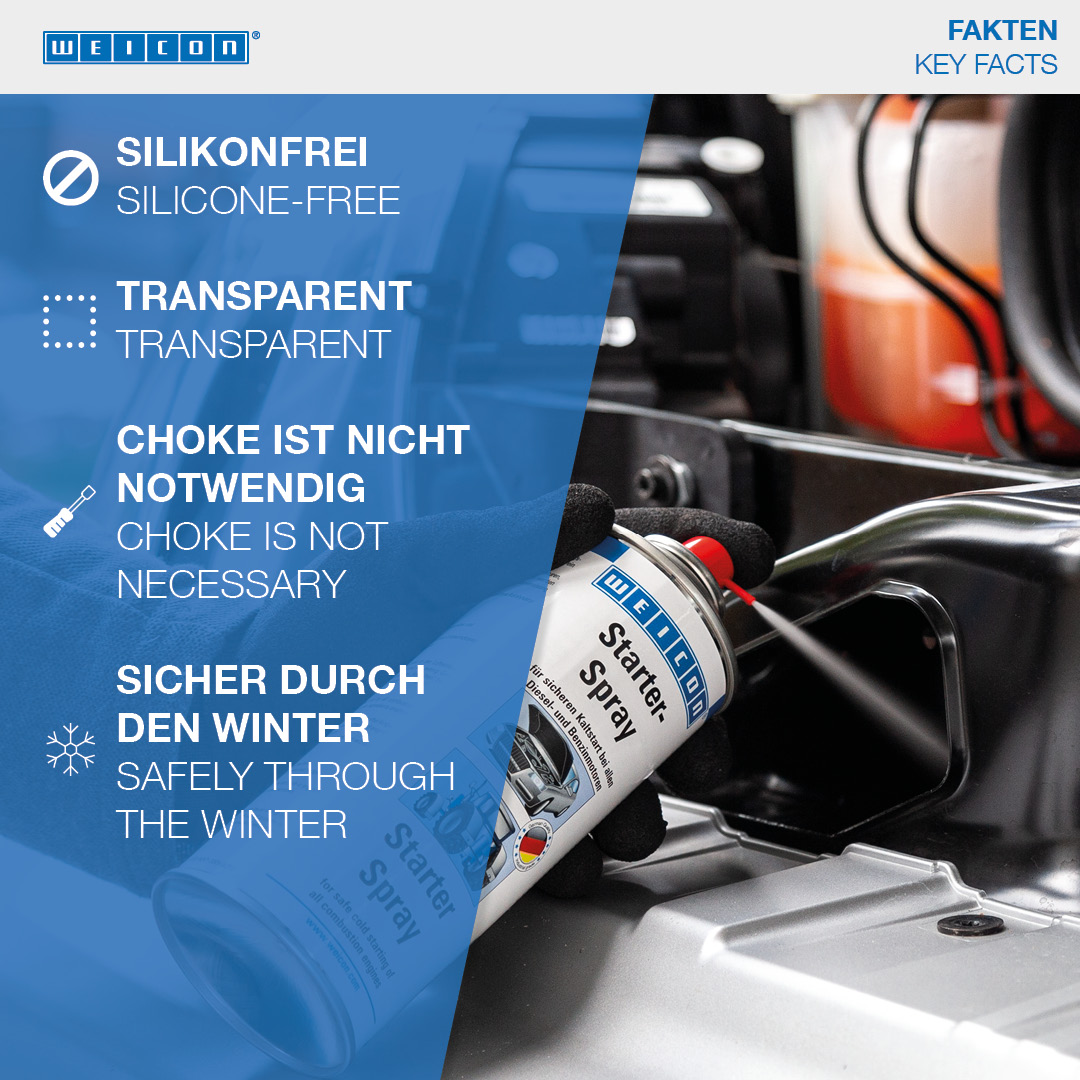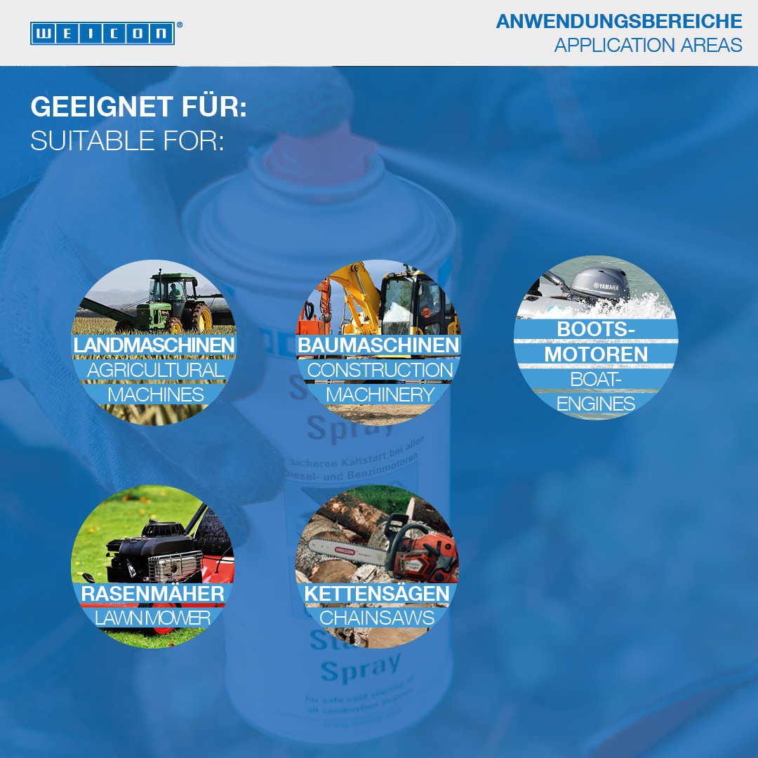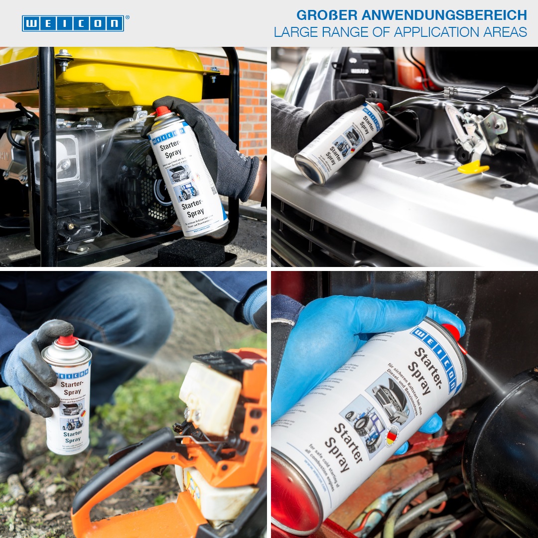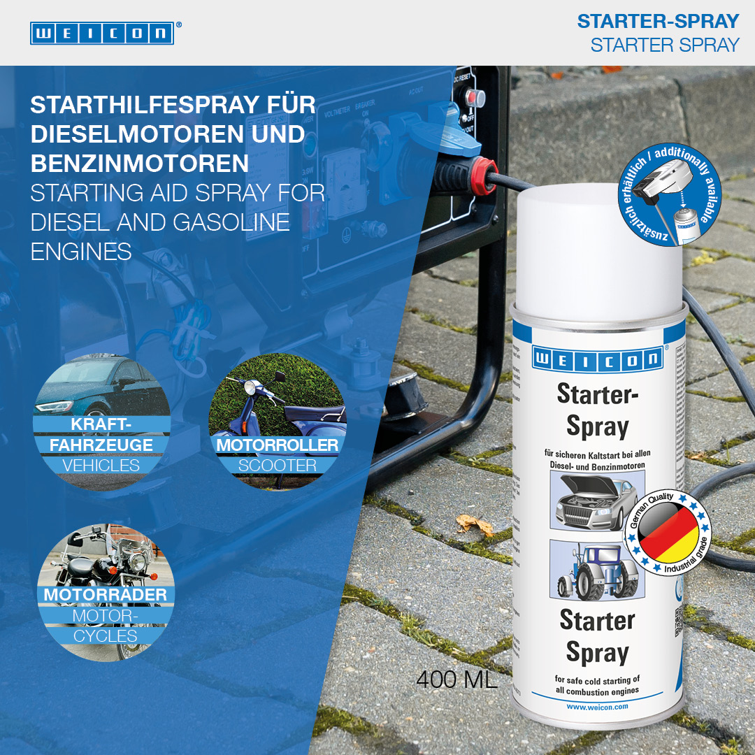 WEICON Starter Spray is suitable for the easy and safe starting of combustion engines. The safe cold starting of all engines is made possible by a special combination of ingredients. Starter Spray is ideal at low temperatures, in damp weather or after longer engine downtimes. That way, it protects both the engine and the battery. WEICON Starter Spray is suited for both diesel and petrol engines. With or without a catalytic converter, whether a motor vehicle, construction machinery, agricultural machinery, chain saws, lawn mowers, boat engines, motorcycles or scooters.