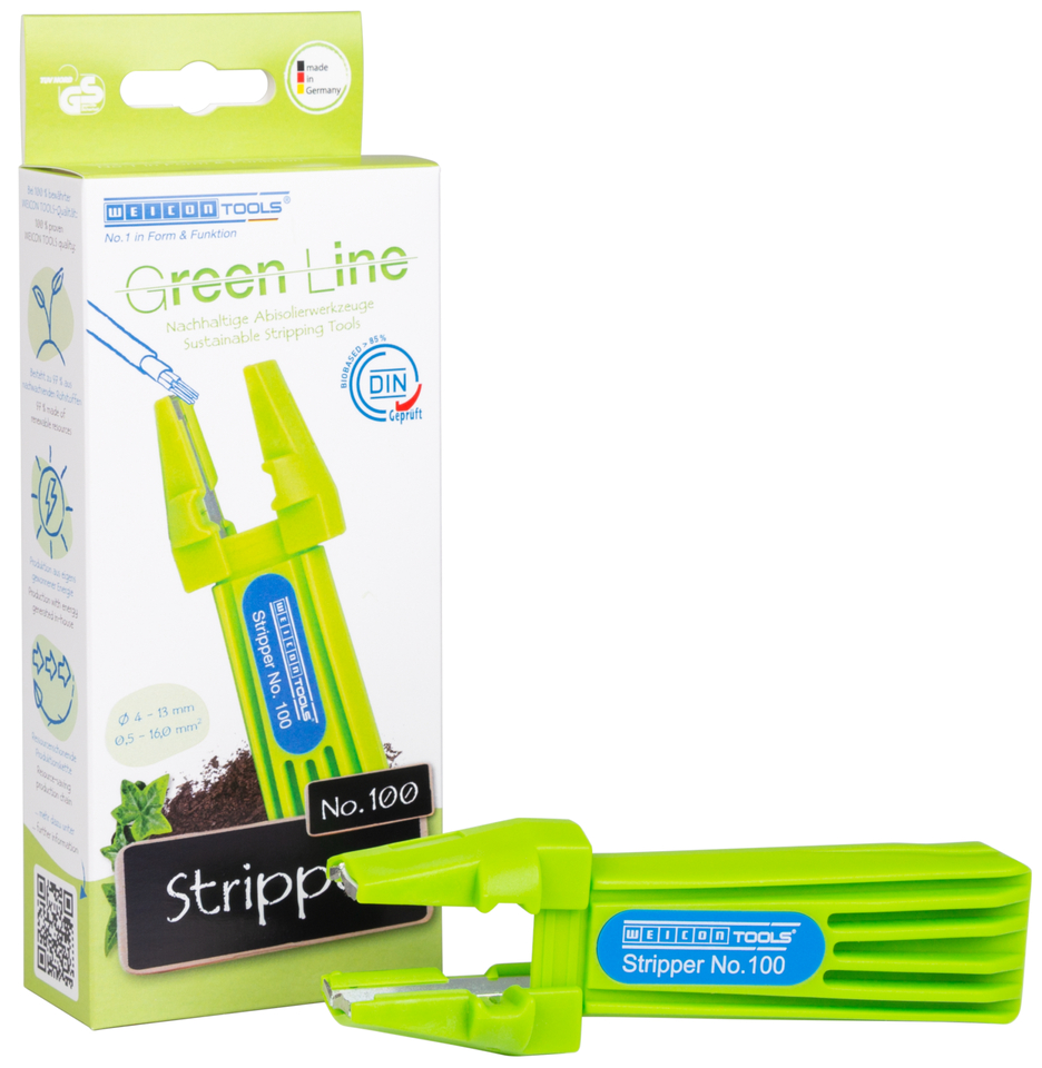 With the Green Line, a very special tool range has been developed. The tools are made of up to 97 % renewable raw materials, which are recyclable and have an excellent life cycle assessment. WEICON Stripper No.100 Green Line is a universal tool for stripping a wide variety of cable types and cross-sections as used in the entire house installation. The tool can be used for circular and longitudinal cutting without adjusting the cutting depth. Especially suitable for flush stripping in ceiling and wall areas, such as in junction and distribution boxes. Also suitable for step-by-step stripping when installing satellite systems.