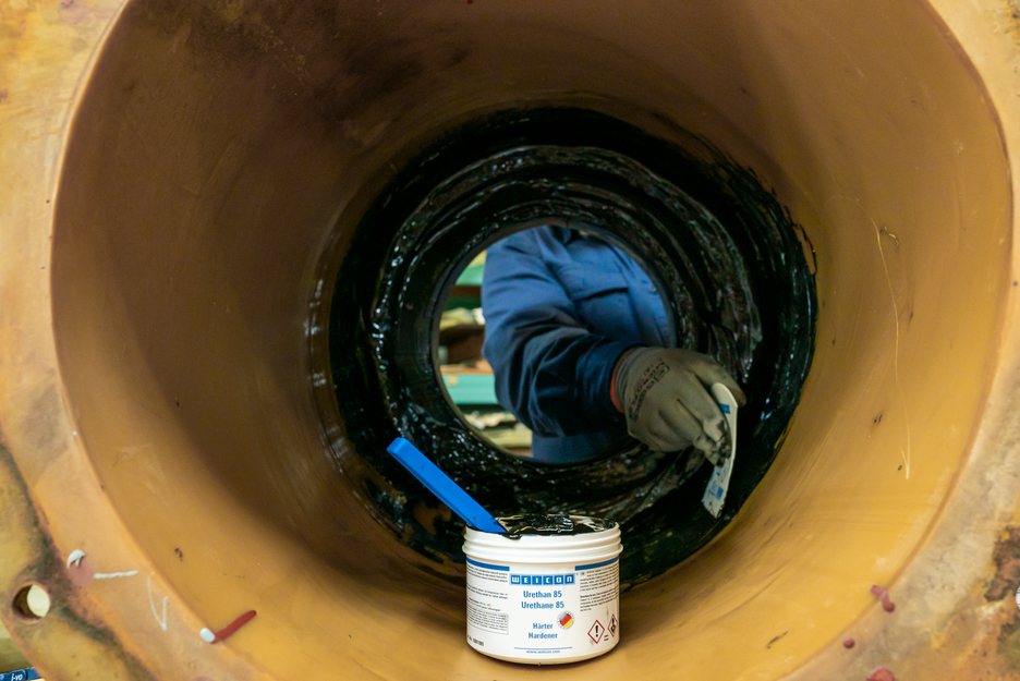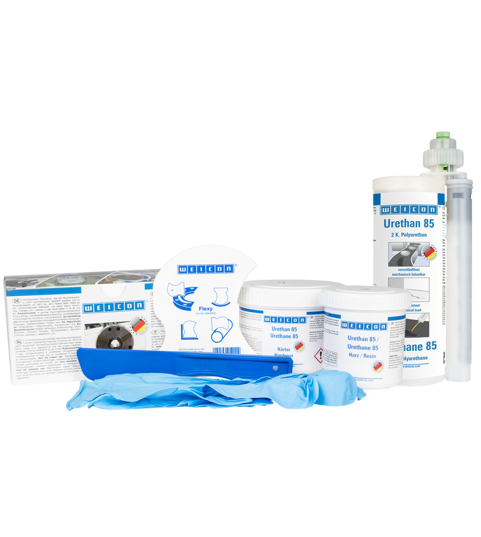 WEICON Urethane 85 is a 2-C polyurethane putty with excellent mechanical strength for the quick repair, touch-up and coating of rubber and metal pieces, which are exposed to shocks, abrasion, vibration or motion. It shows high elasticity as well as high wear resistance. Urethane 85 is suitable for many applications, such as the repair of rubber components and conveyor belts, the repair and touch-up of rubber coatings, as flexible wear protection for pump housings and impellers as well as for the quick repair of worn-out seals and rubber rollers.