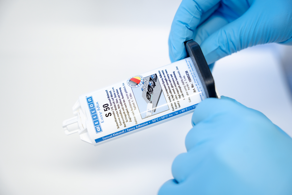 Application aid for Easy-Mix products in 50 ml cartridge. Pusher for mixing ratios 1:1; 2:1 and 10:1. Space-saving application aid for the toolbox. Easy to use, reliable results.