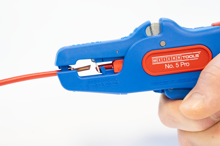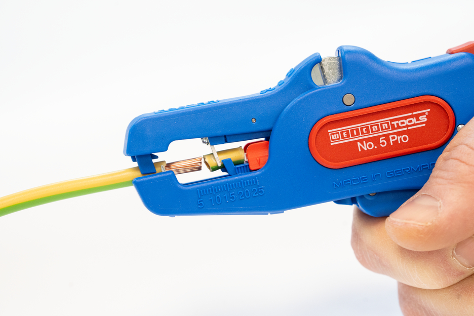 The automatic wire stripper can be used for stripping all common stranded and solid conductors from 0.2 to 16 mm². An adjustable length stop from 5 to 25 mm enables very precise and accurate working. The length stop can be removed, if required. The wire stripper automatically to adjusts to the required conductor cross-section – so no manual adjustment is necessary. The stripping tool features an integrated side cutter, which is suitable for conductors made of copper and aluminium up to a diameter of three millimetres. Thanks to slim design of the tool, the stripper can also be used in working areas that are difficult to access, such as in switch cabinets. The mechanics of the stripping tool are very smooth-running and have proven to be durable and reliable in numerous tests. The wire stripper has a non-slip multi-component handle in the blue-red "Ice Crack" design. The wire stripper has an eyelet to attach a strap for fall protection and is equipped with a labelling surface to be able to individualise the tool. In addition, the tool has a locking mechanism for space-saving storage.