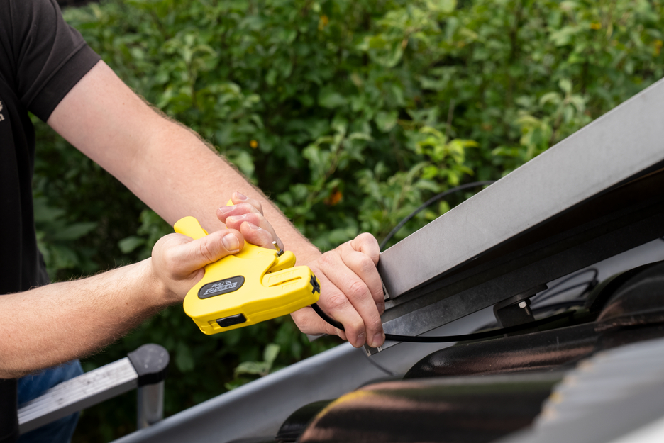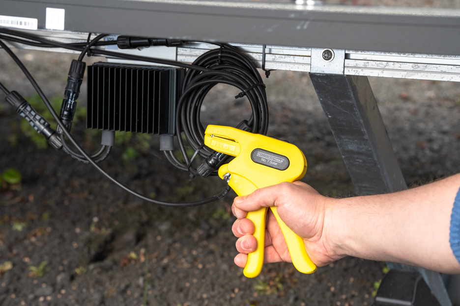 Special tool for stripping all common cables in the solar sector I Precise working due to optical linear measure (up to 24 mm) I Automatic wire stripper I Integrated, well-accessible side cutter up to 3 mm Ø I Working range 1.5 - 10 mm²
