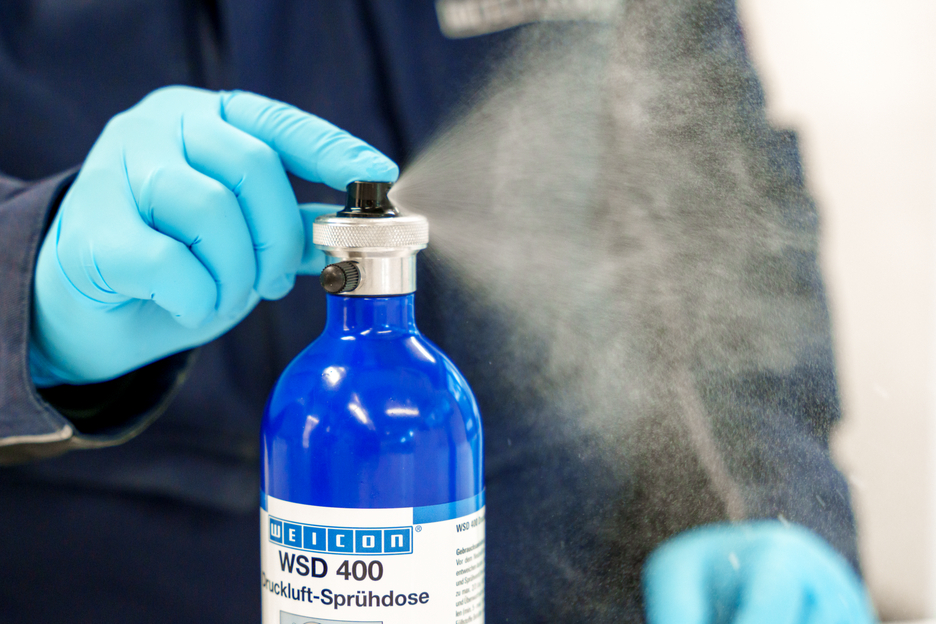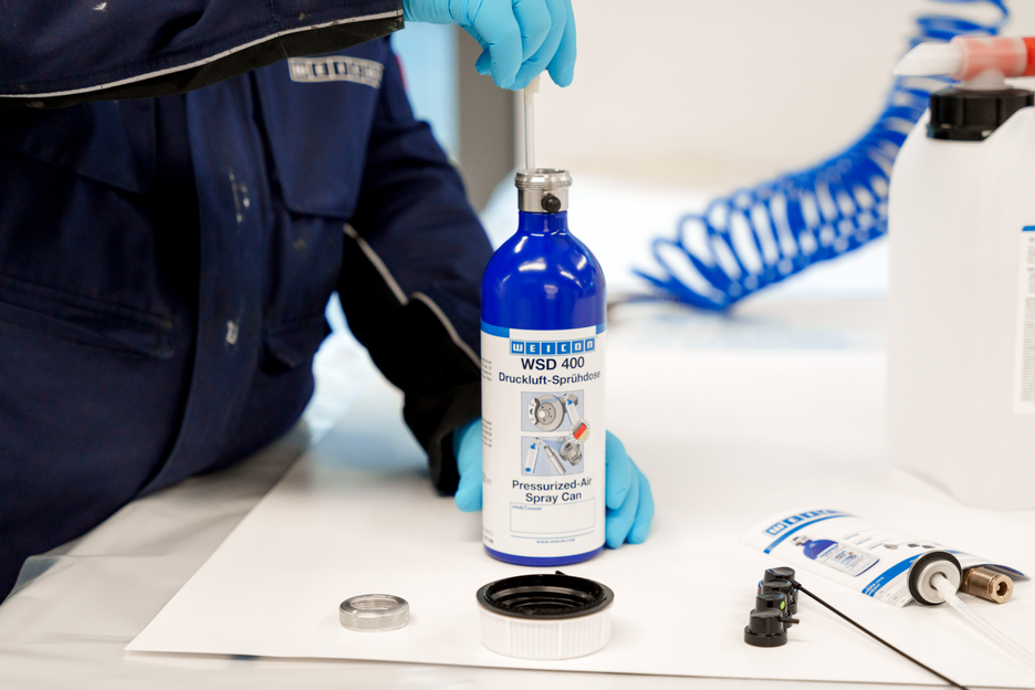 WSD 400 refillable spray can suitable for processing most WEICON Technical Liquids. Filling with compressed air is done by means of an adapter (accessory) via the compressed air network (optimum operating pressure 7.5 bar). The range of accessories for the WSD 400 includes an adapter for filling on any compressed air system as well as a spray set with four different spray heads and a ball valve with suction pipe.