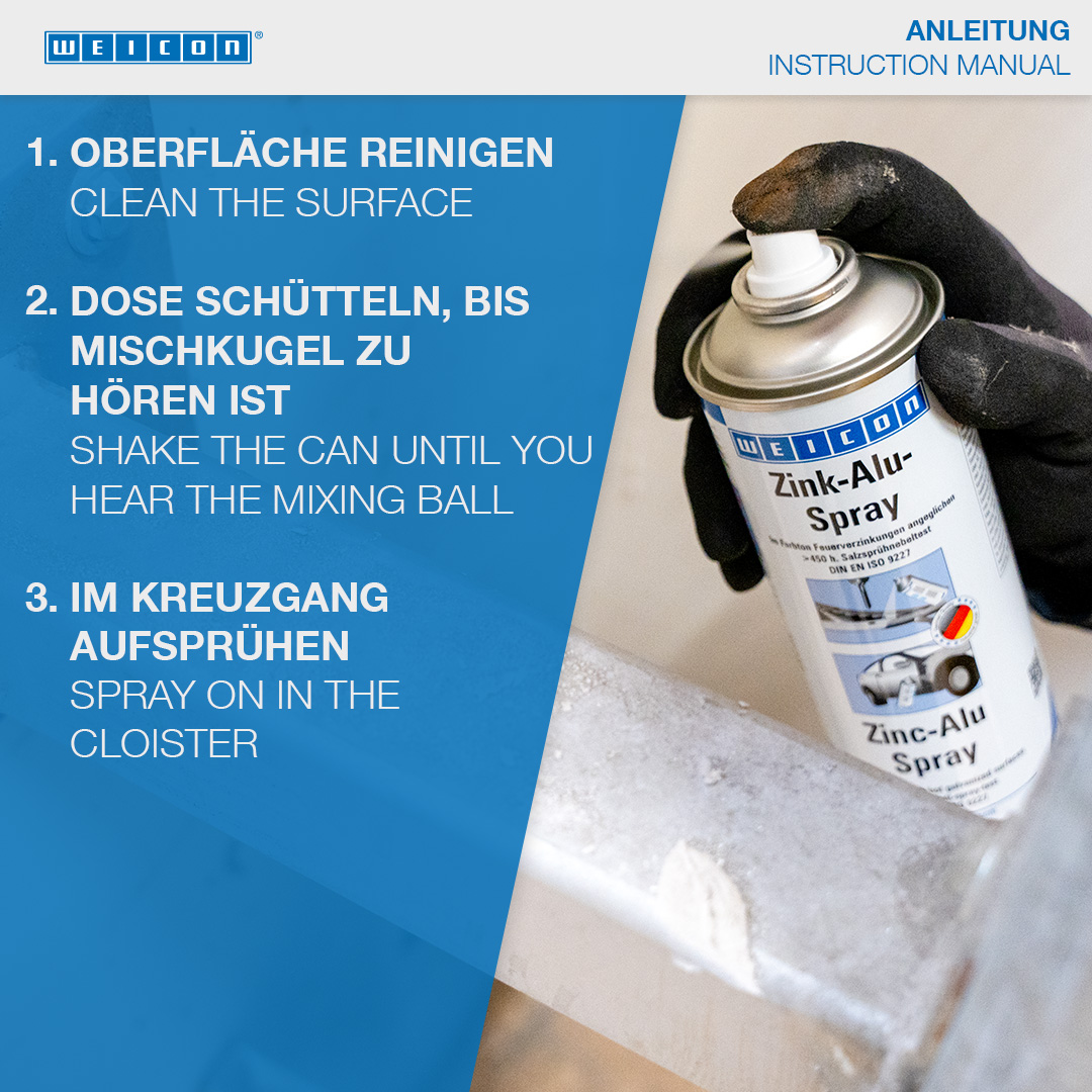 WEICON Zinc-Alu Spray permanently protects all metal surfaces against rust and corrosion. It forms a fast-drying and adherent protective layer and is resistant to many chemicals. Zinc-Alu Spray can be used for repairing hot galvanized parts with matching colours and for the coating of welded joints and drill holes.