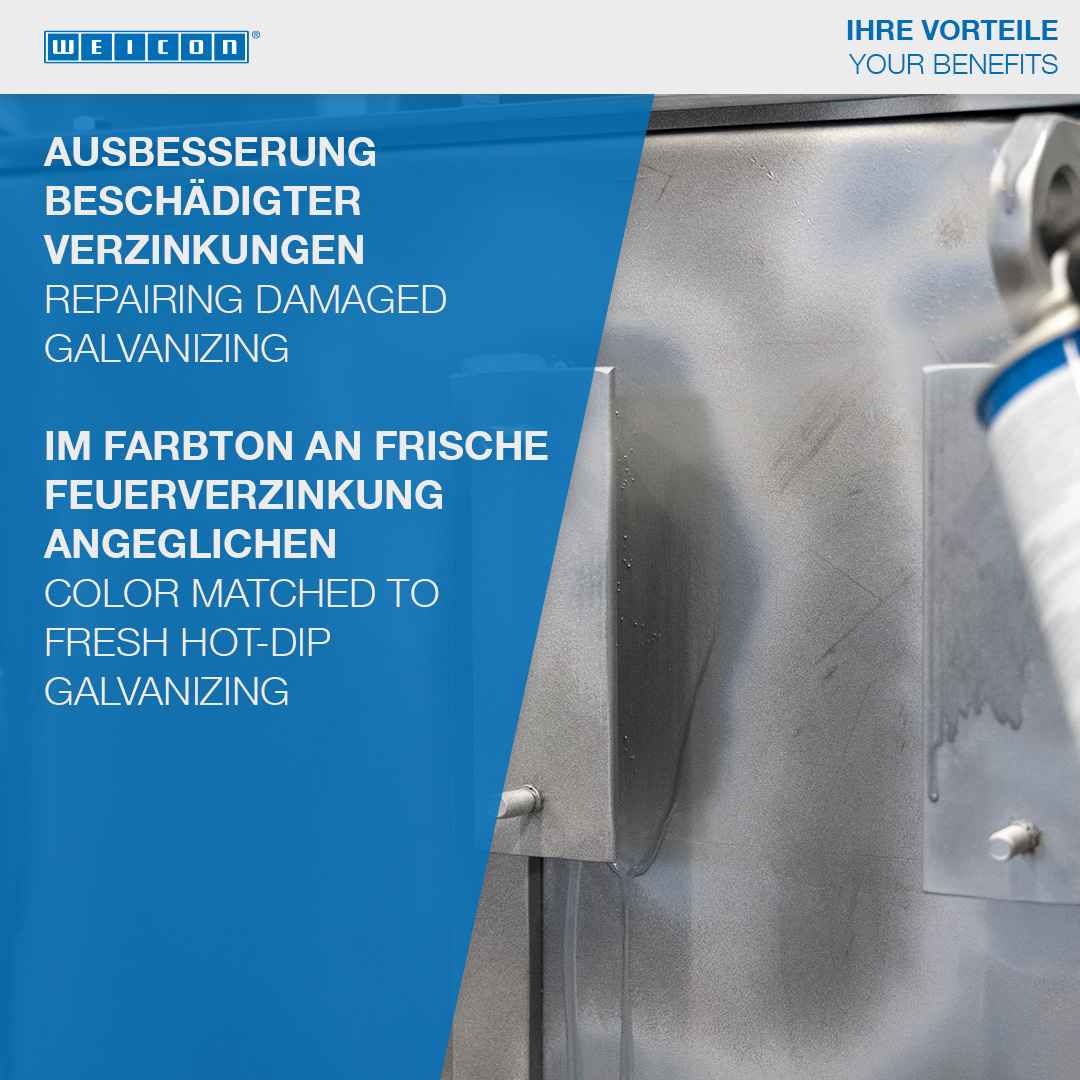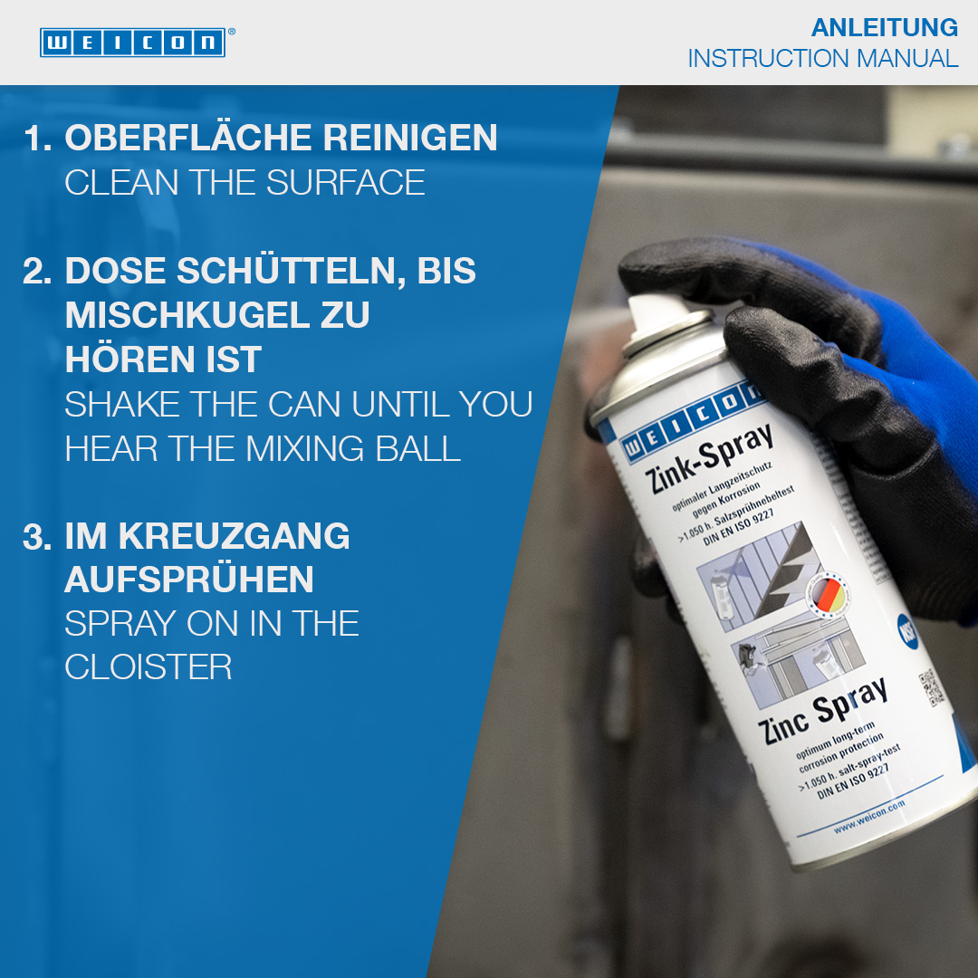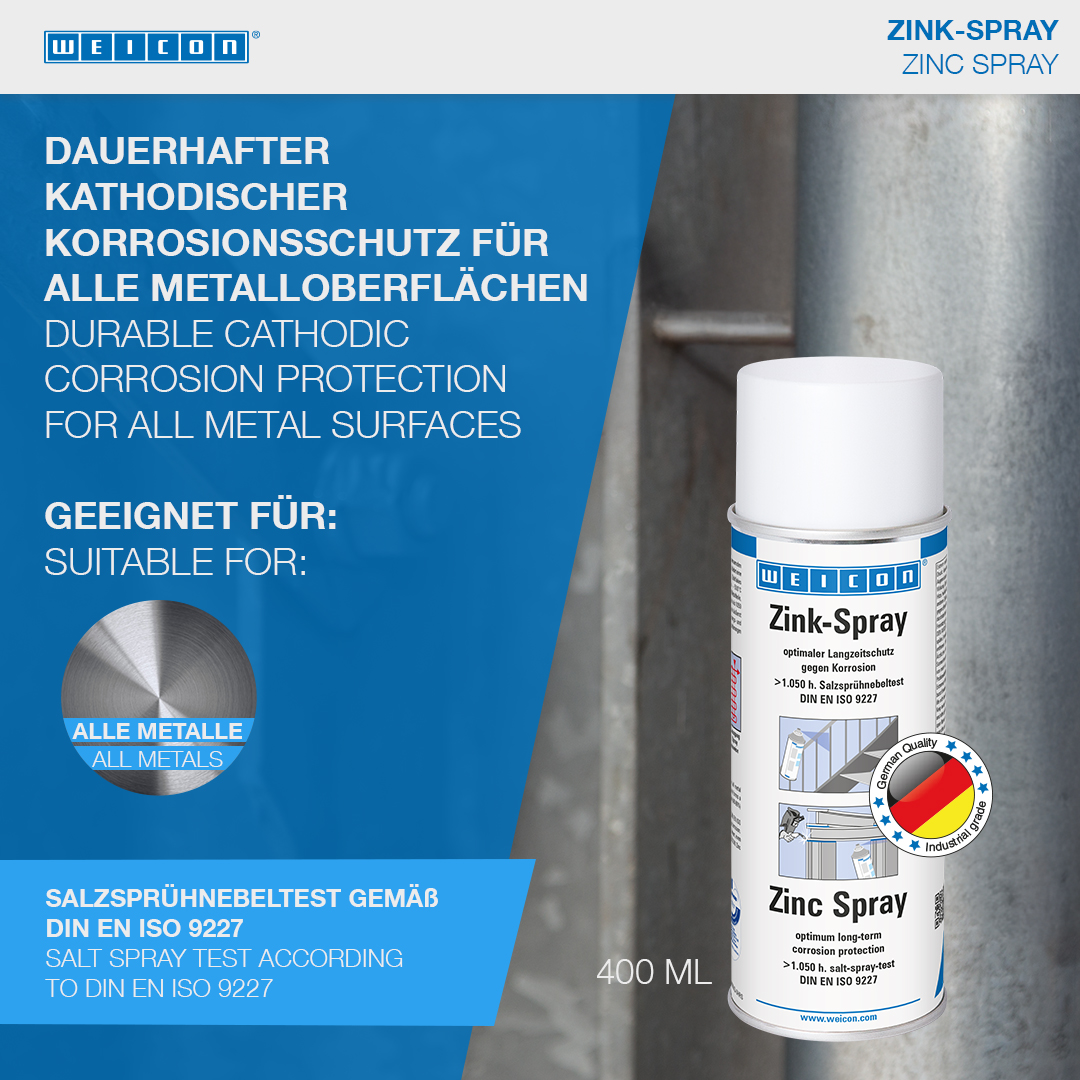 WEICON Zinc Spray is approved by the German TÜV and provides all metal surfaces with a long-lasting cathodic corrosion protection. It forms a fast-drying, adherent protective layer of microfine zinc flakes. Even after more than 1050 hours in the salt spray test according to DIN EN ISO 9227, metal parts coated with WEICON Zinc Spray did not show any signs of corrosion. The zinc flakes form a resistant protective layer even against extreme weather and environmental conditions. That way, WEICON Zinc Spray fulfils higher requirements than those defined by the DIN EN ISO 1461 standard. WEICON Zinc Spray can be used as a high-grade anti-rust primer, for the coating of welded joints and drill holes, as a conductive intermediate layer for spot welding and wherever metal must be protected against corrosion.